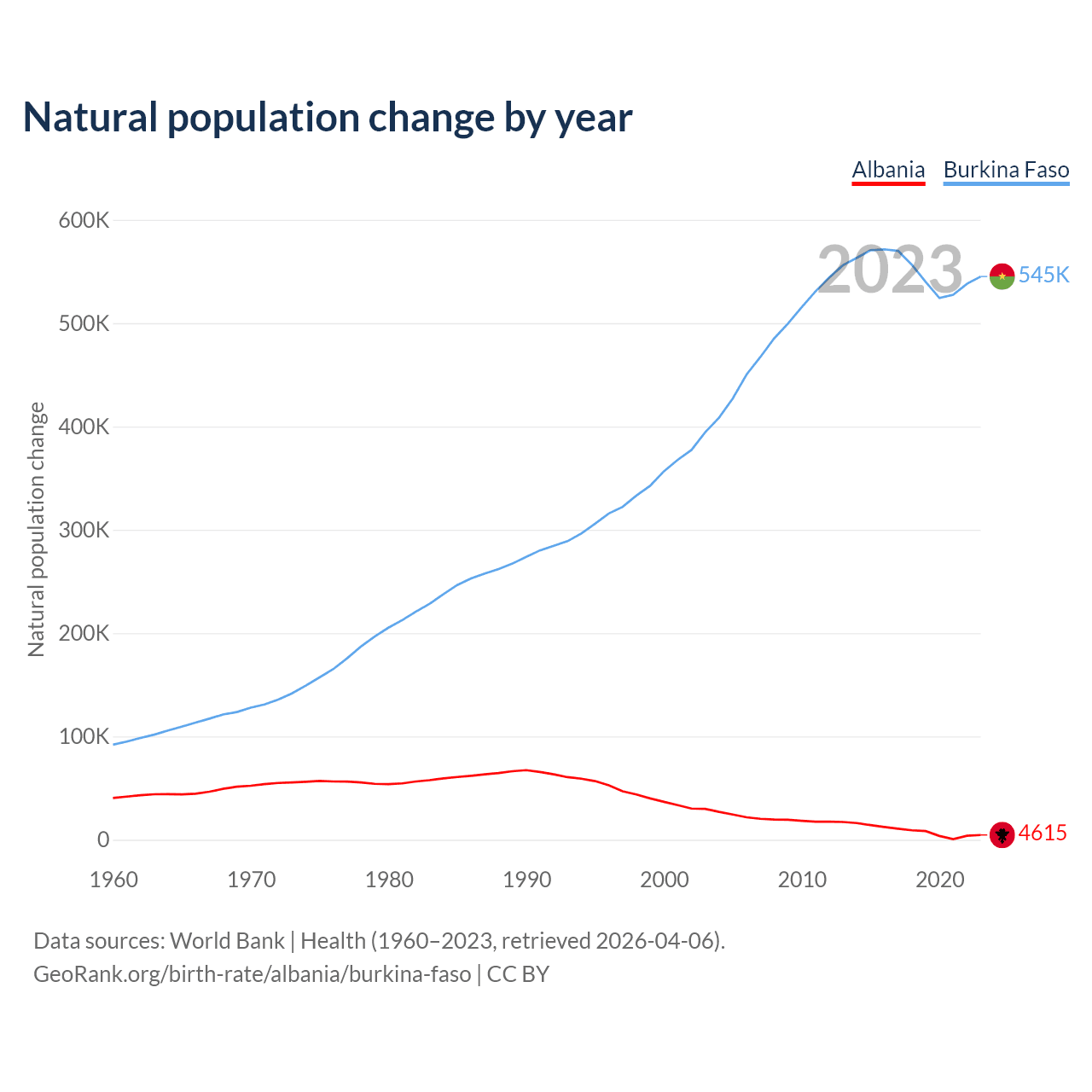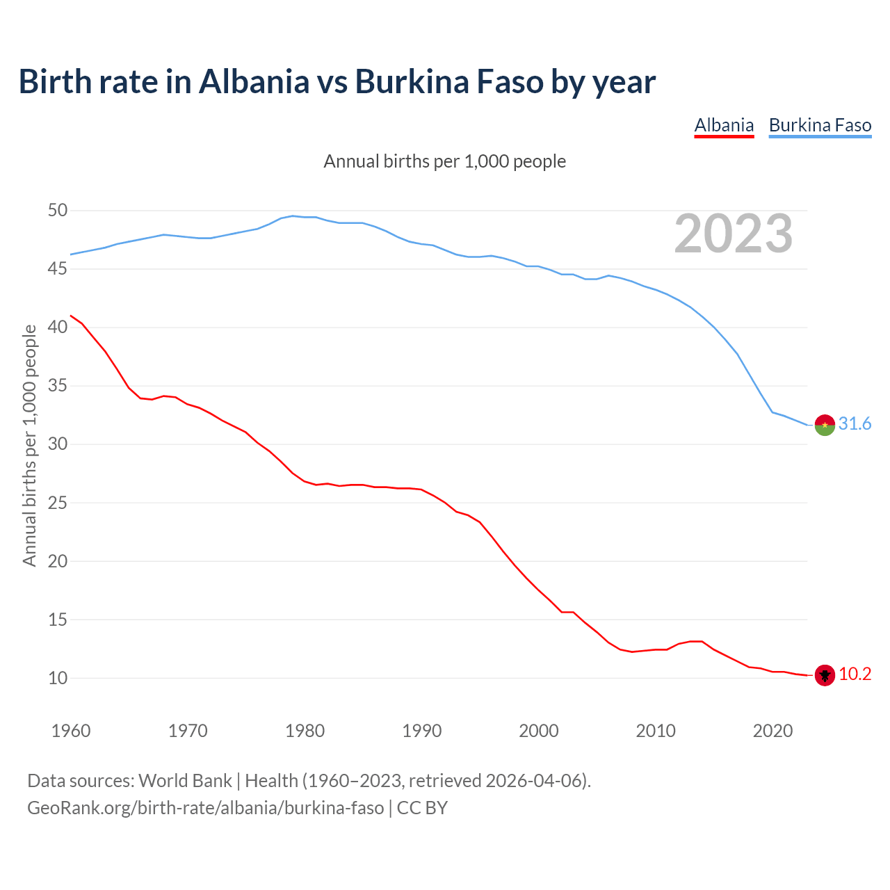Albania has an annual birth rate of 10.2 births per 1,000 people, compared to 31.6 for Burkina Faso. The average number of children a woman is expected to have during her lifetime — the fertility rate, is 1.35 in Albania and 4.19 in Burkina Faso — 210.5% difference.