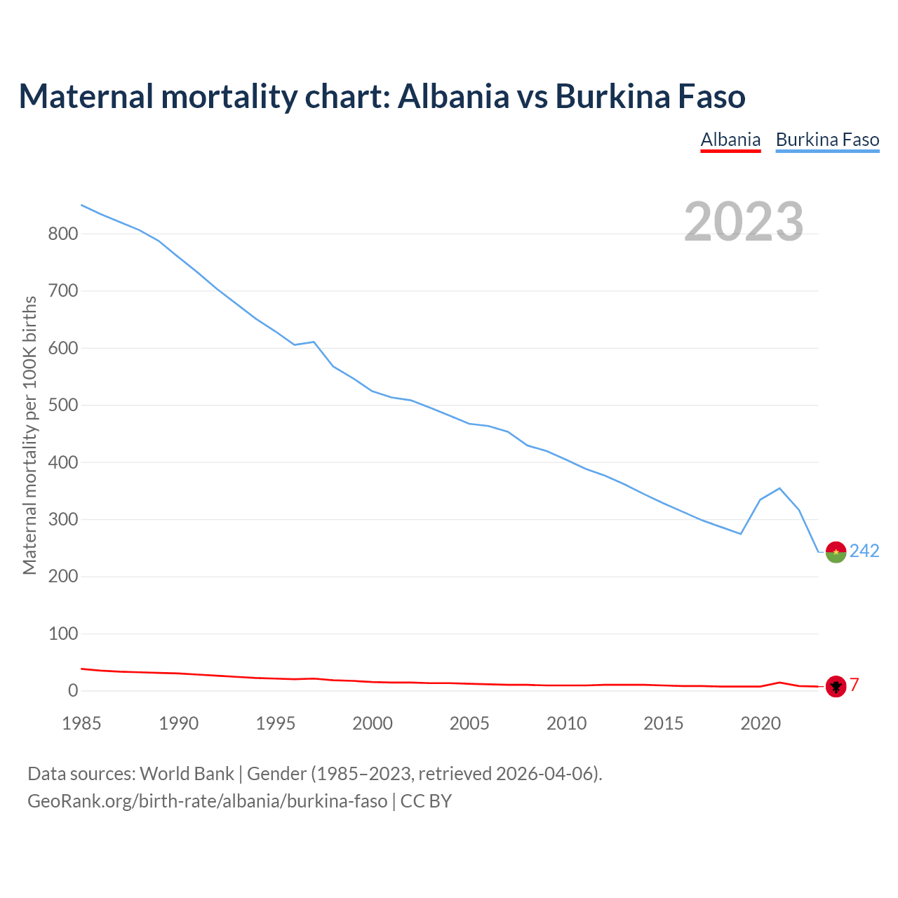 The maternal mortality rate, which is the probability of dying during childbirth or within 42 days of pregnancy termination, is 7 deaths per 100,000 live births in Albania, compared to 242 deaths in Burkina Faso.