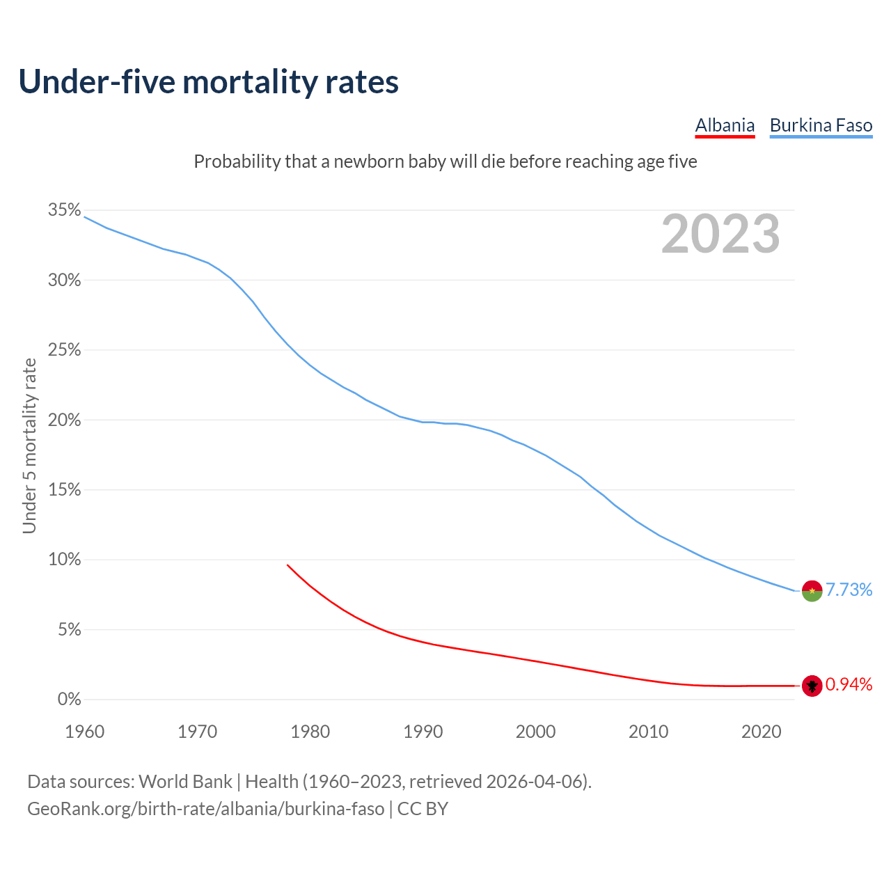 The chance that a newborn baby will die before reaching age five is 0.94% in Albania and 7.73% in Burkina Faso. Above is a chart with historical data on under-five mortality rates.