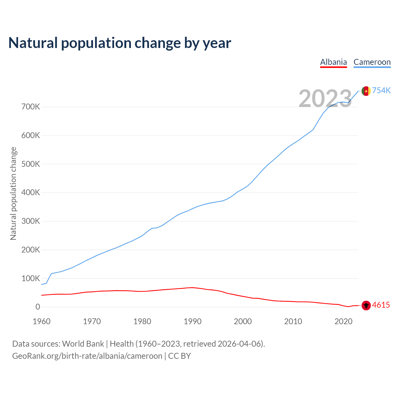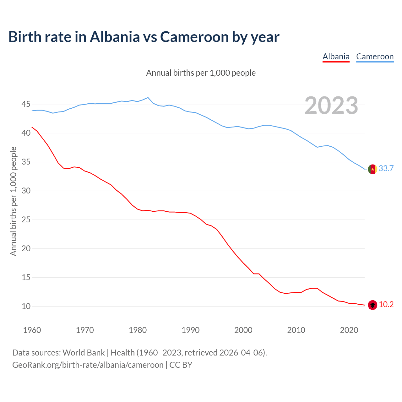 Albania has an annual birth rate of 10.2 births per 1,000 people, compared to 33.7 for Cameroon. The average number of children a woman is expected to have during her lifetime — the fertility rate, is 1.35 in Albania and 4.32 in Cameroon — 220.6% difference.