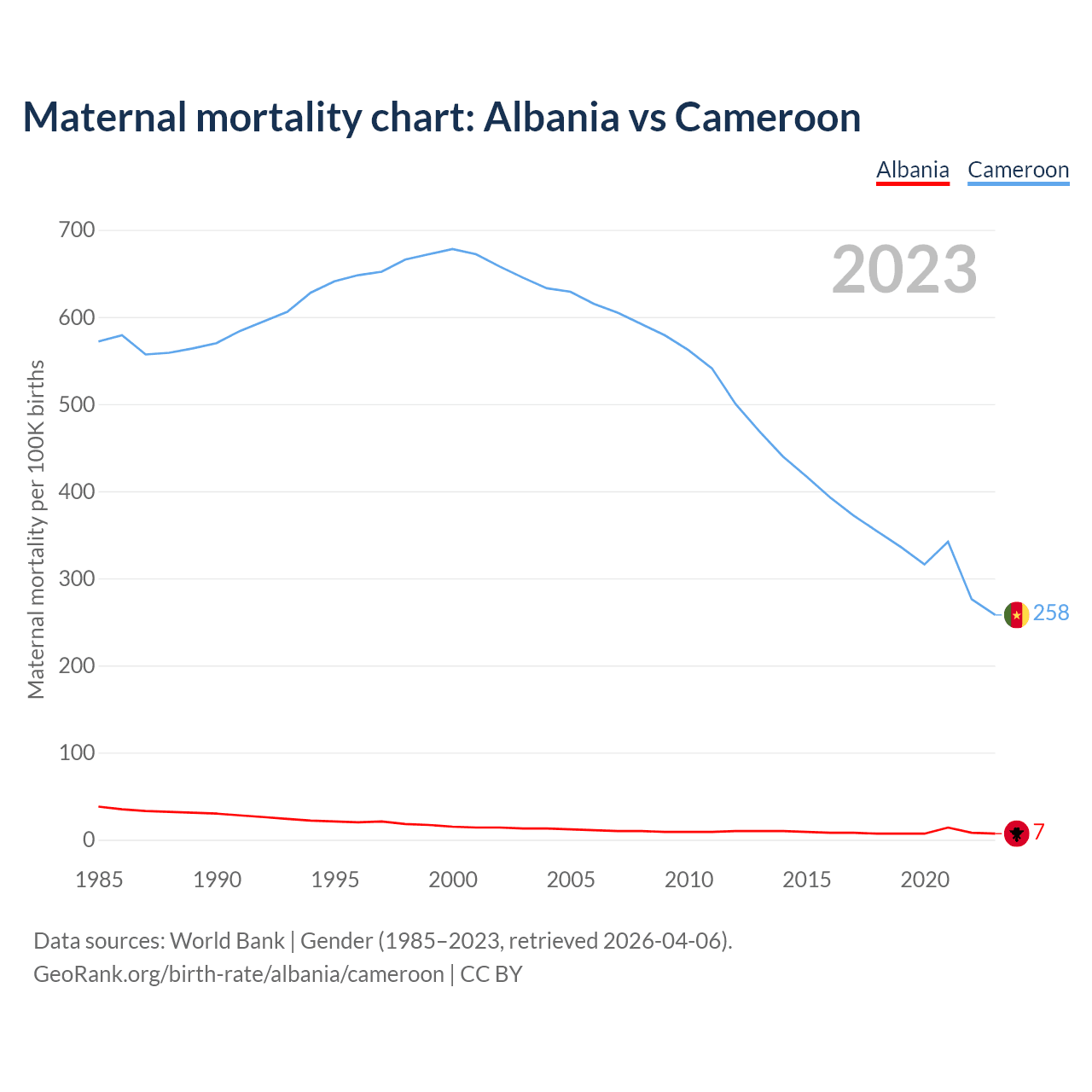 The maternal mortality rate, which is the probability of dying during childbirth or within 42 days of pregnancy termination, is 7 deaths per 100,000 live births in Albania, compared to 258 deaths in Cameroon.