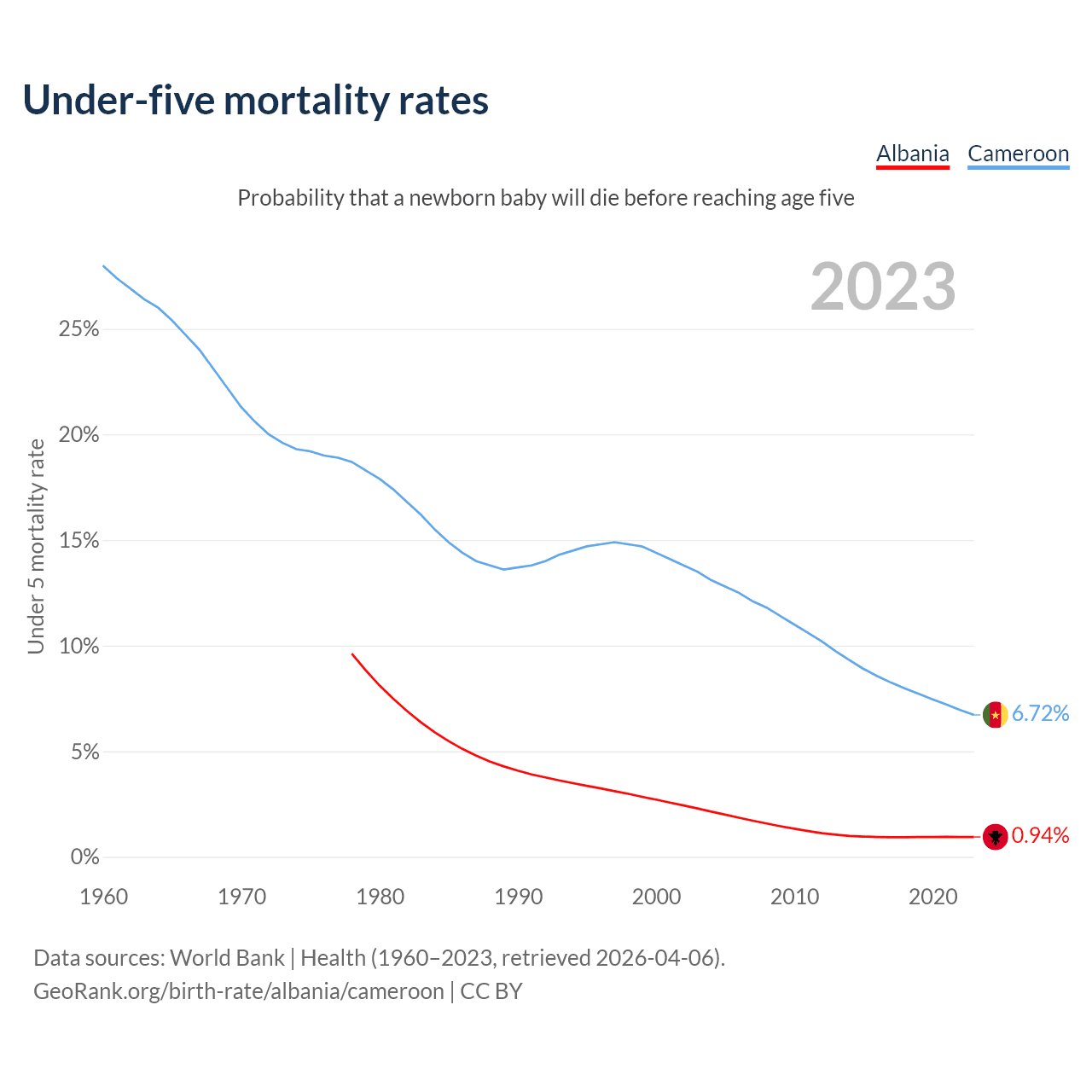 The chance that a newborn baby will die before reaching age five is 0.94% in Albania and 6.72% in Cameroon. Above is a chart with historical data on under-five mortality rates.