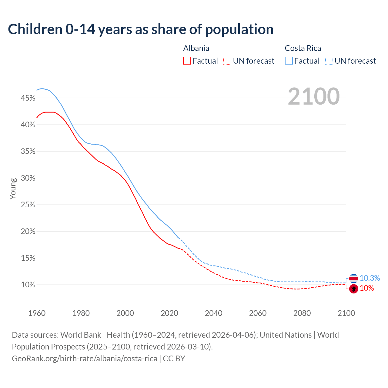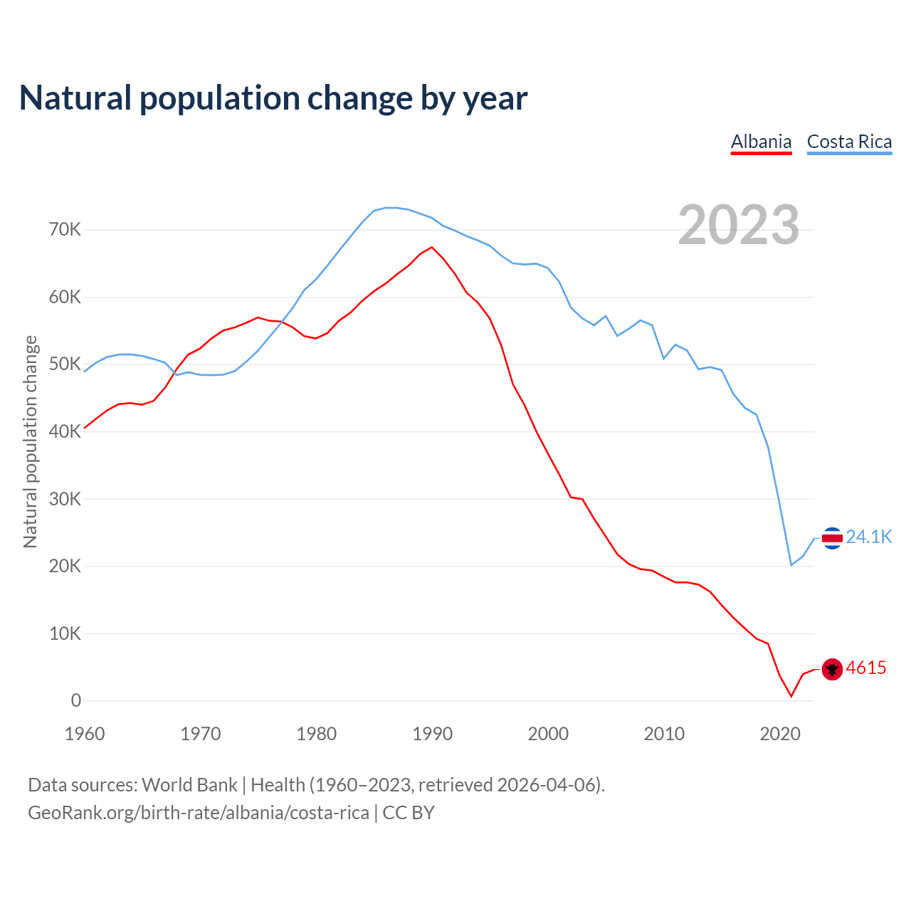 According to the latest available data on birth rates, the fertility rate in Albania was 1.35 children per woman in 2023, compared to 1.33 in Costa Rica in 2023. The replacement level is considered to be 2.1 children per woman.