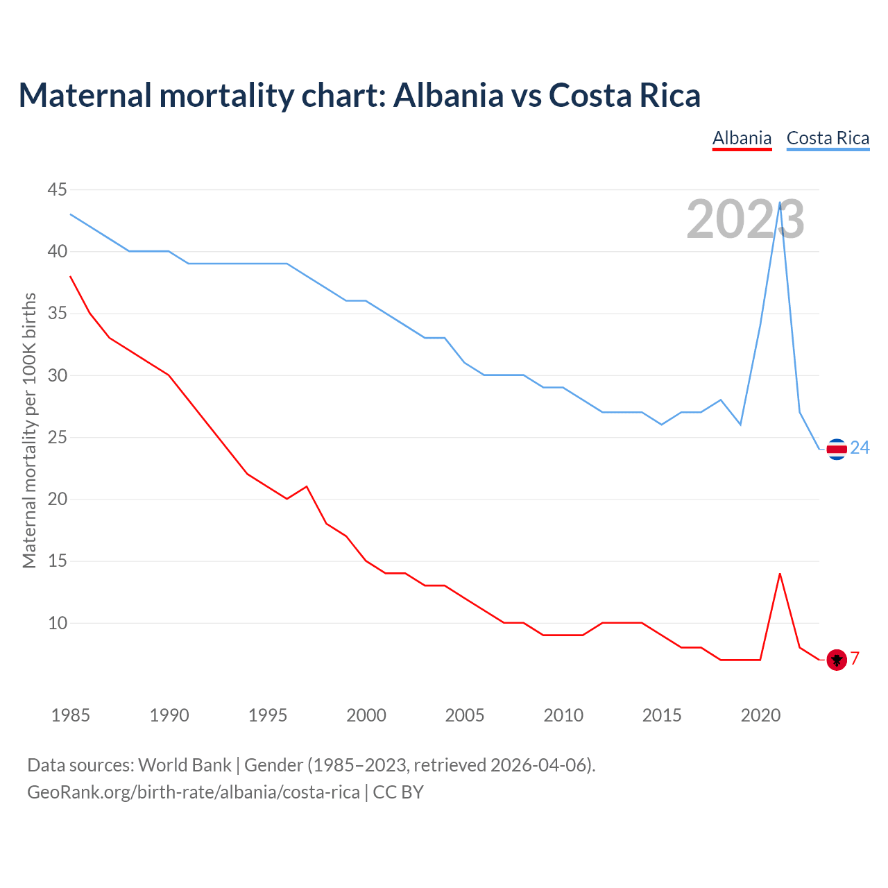 The maternal mortality rate, which is the probability of dying during childbirth or within 42 days of pregnancy termination, is 7 deaths per 100,000 live births in Albania, compared to 24 deaths in Costa Rica.