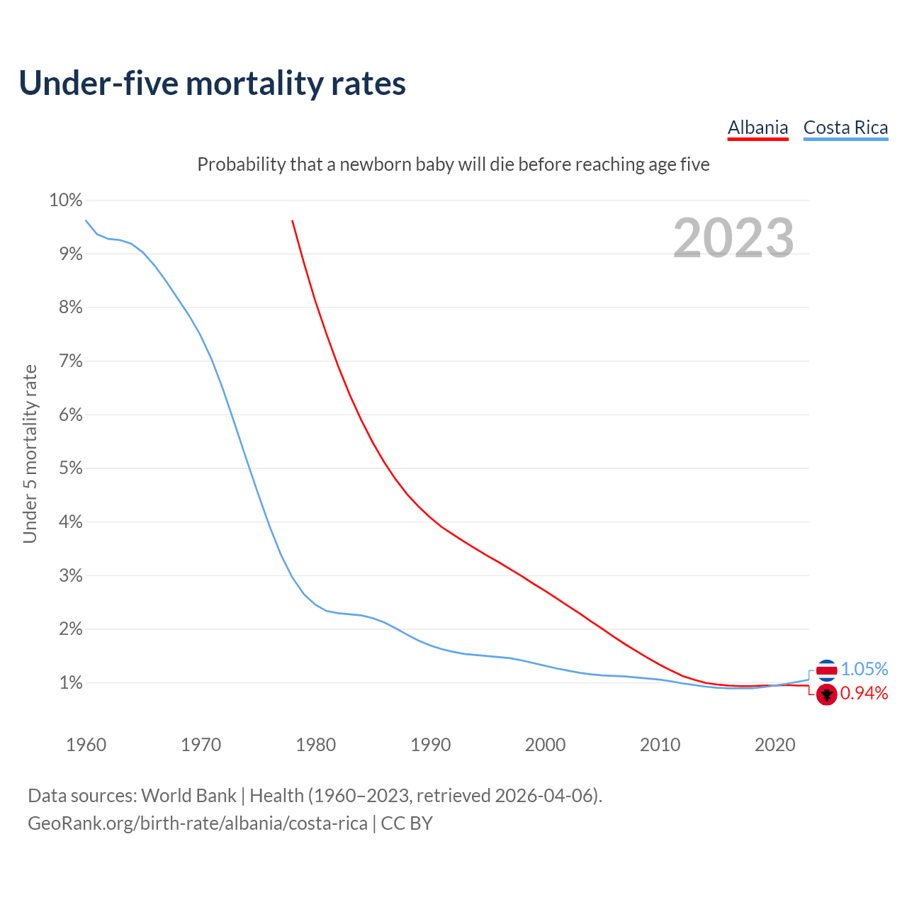 The chance that a newborn baby will die before reaching age five is 0.94% in Albania and 1.05% in Costa Rica. Above is a chart with historical data on under-five mortality rates.