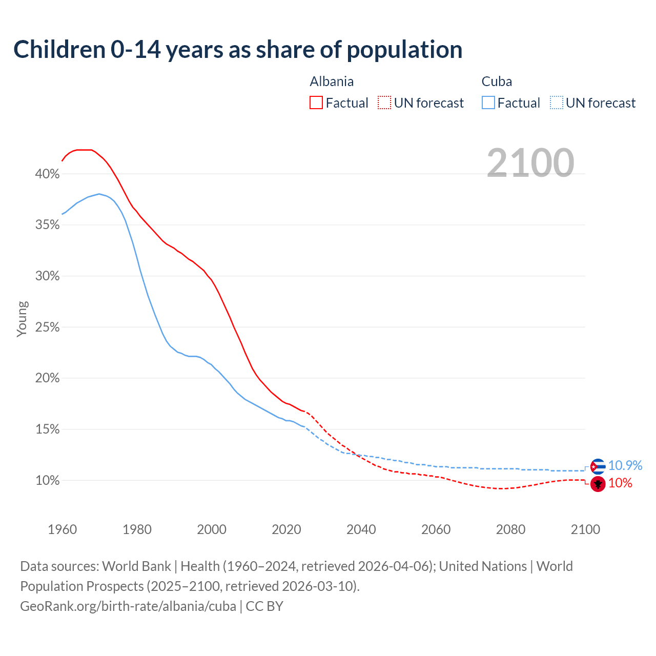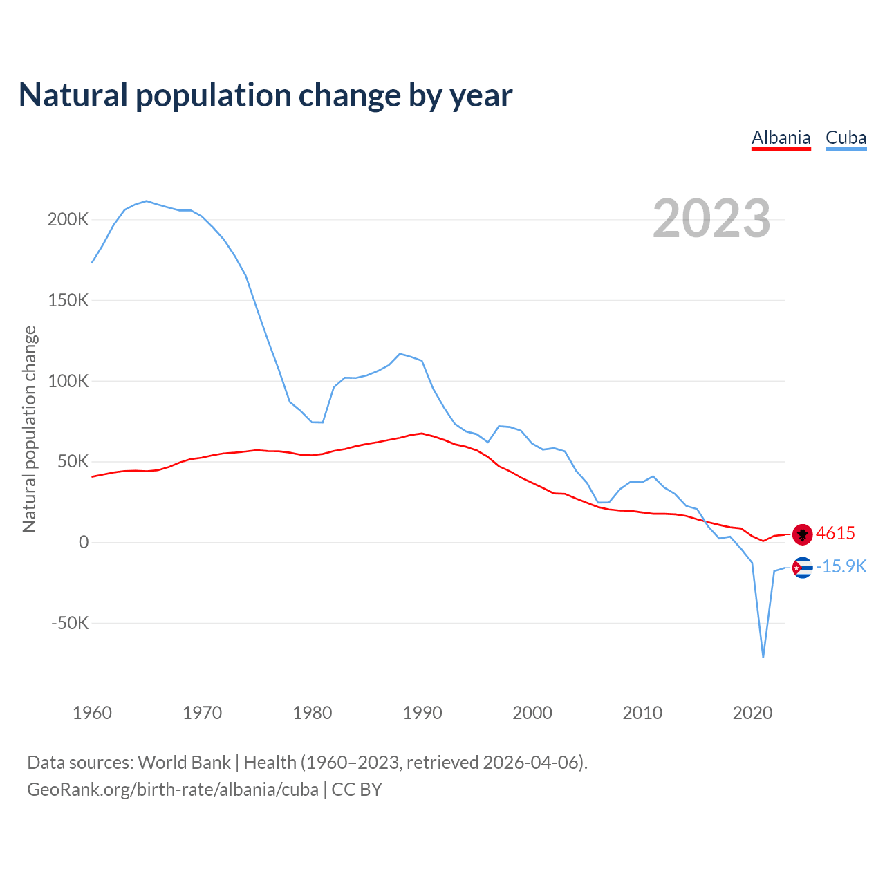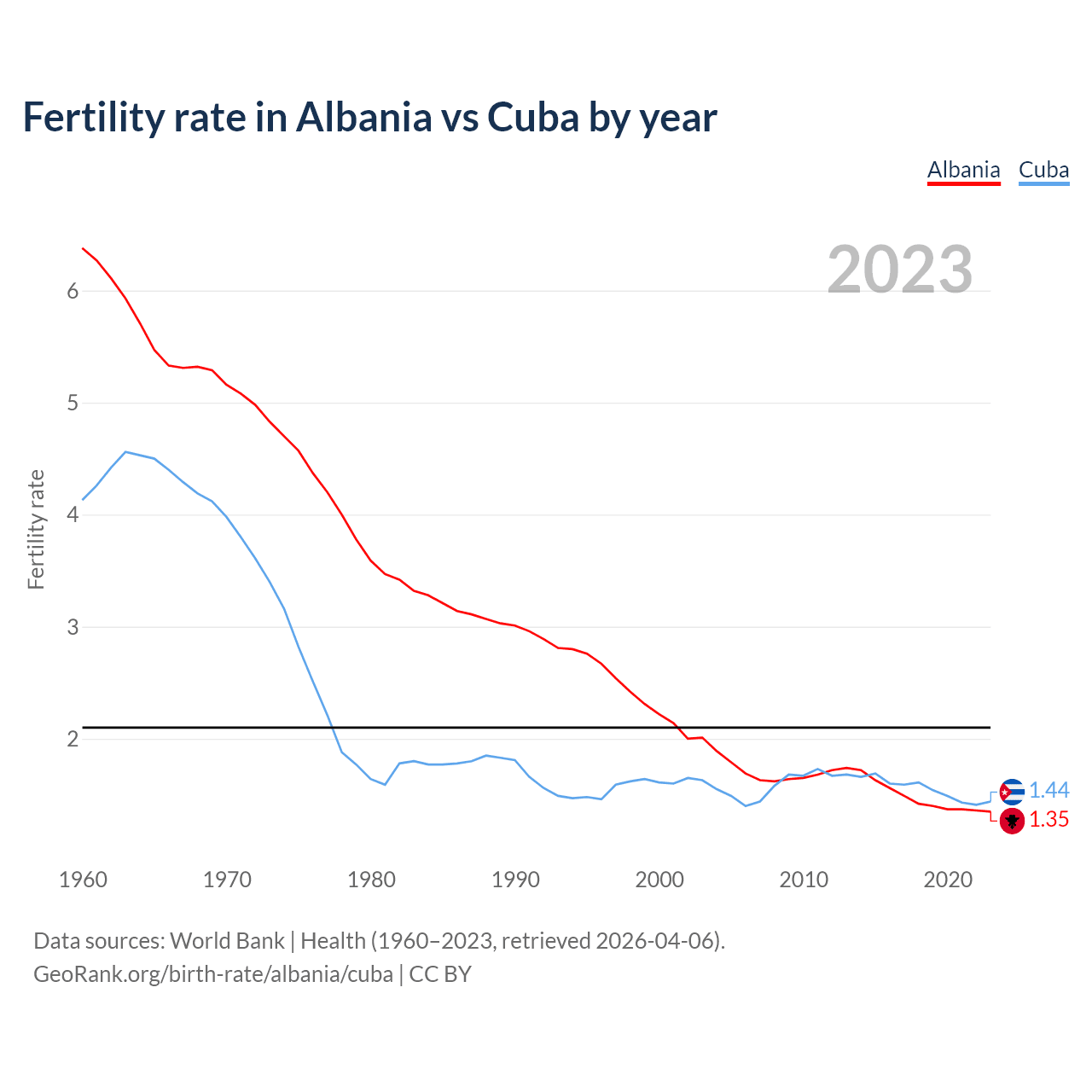 Albania has an annual birth rate of 10.2 births per 1,000 people, compared to 8.71 for Cuba. The average number of children a woman is expected to have during her lifetime — the fertility rate, is 1.35 in Albania and 1.44 in Cuba — 6.75% difference.