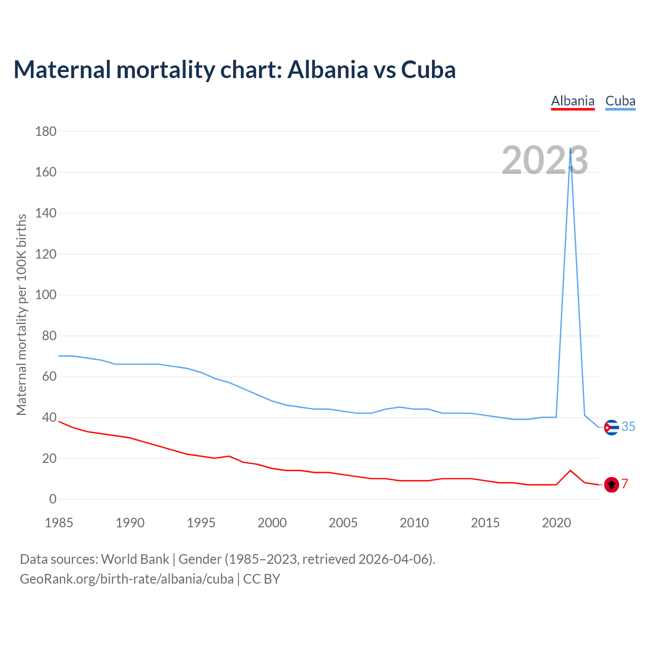 The maternal mortality rate, which is the probability of dying during childbirth or within 42 days of pregnancy termination, is 7 deaths per 100,000 live births in Albania, compared to 35 deaths in Cuba.