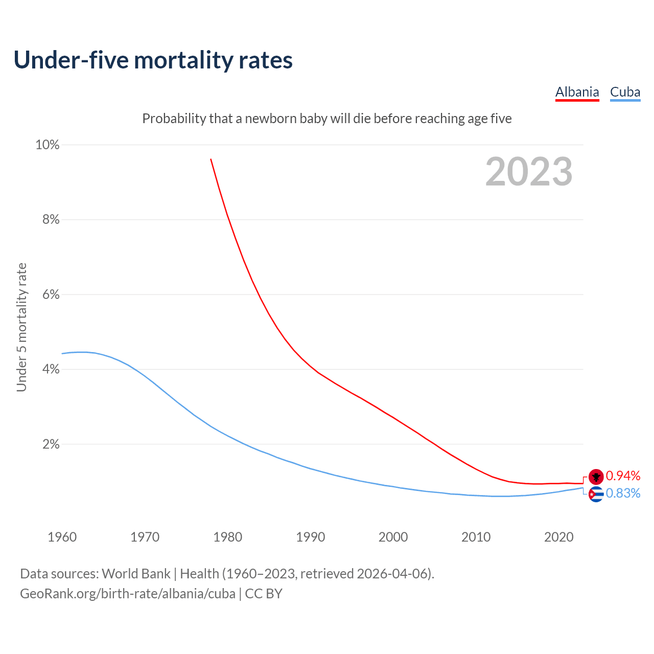 The chance that a newborn baby will die before reaching age five is 0.94% in Albania and 0.83% in Cuba. Above is a chart with historical data on under-five mortality rates.