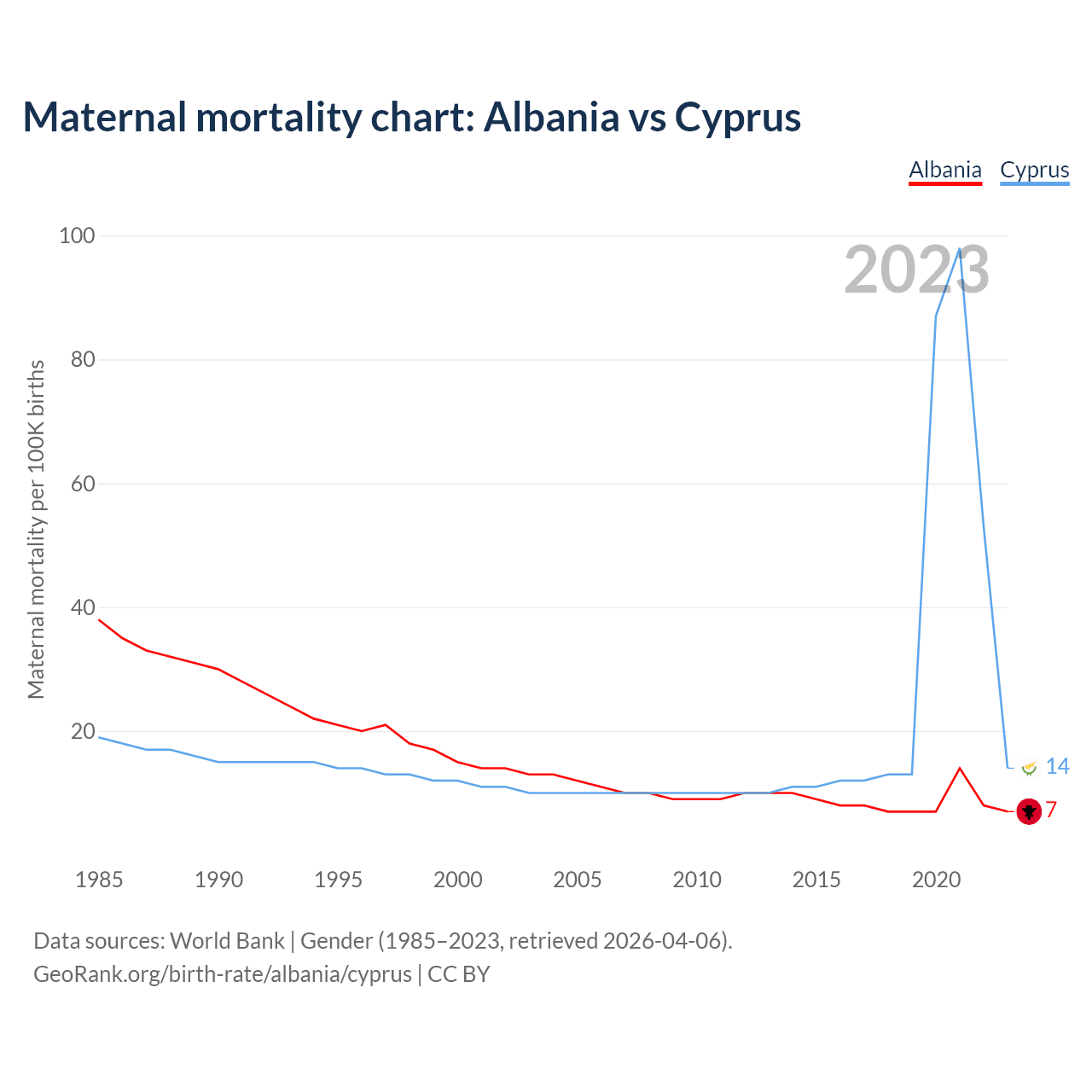 The maternal mortality rate, which is the probability of dying during childbirth or within 42 days of pregnancy termination, is 7 deaths per 100,000 live births in Albania, compared to 14 deaths in Cyprus.