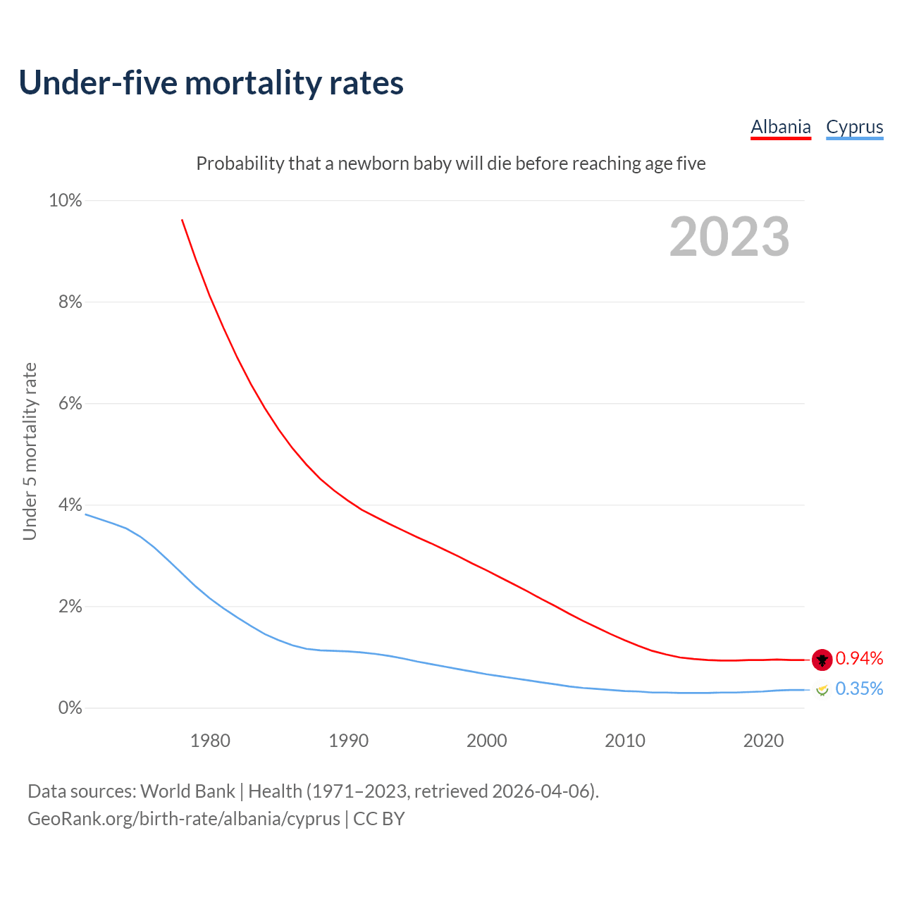 The chance that a newborn baby will die before reaching age five is 0.94% in Albania and 0.35% in Cyprus. Above is a chart with historical data on under-five mortality rates.