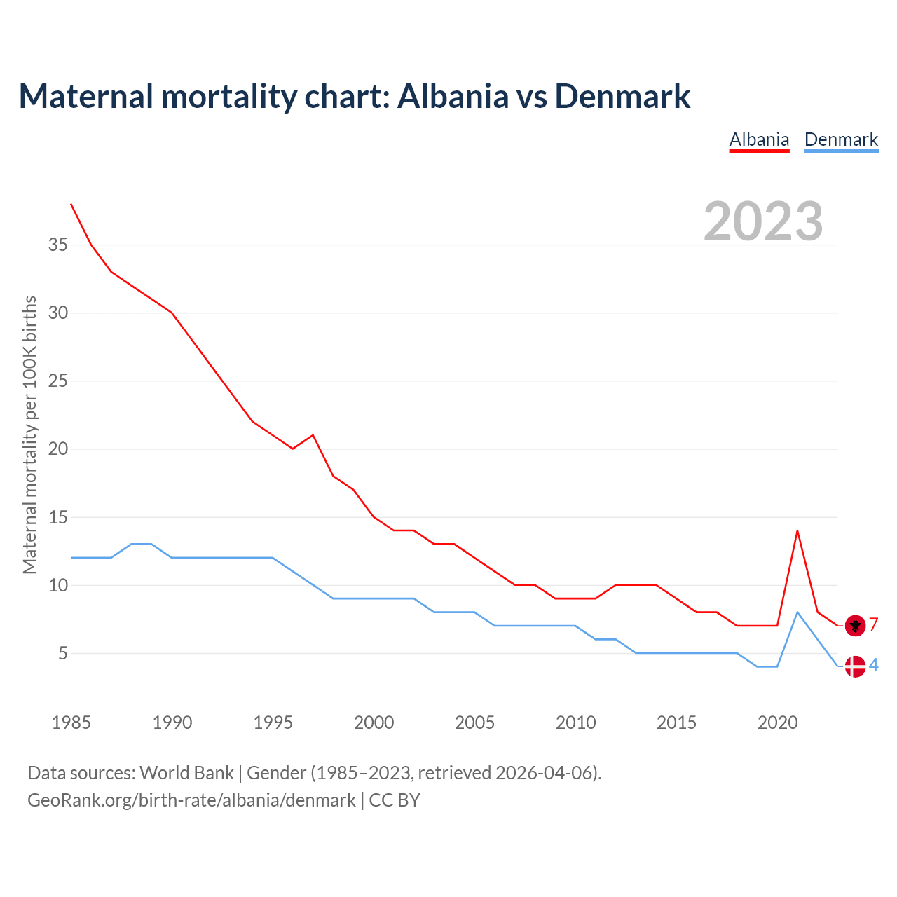 The maternal mortality rate, which is the probability of dying during childbirth or within 42 days of pregnancy termination, is 7 deaths per 100,000 live births in Albania, compared to 4 deaths in Denmark.