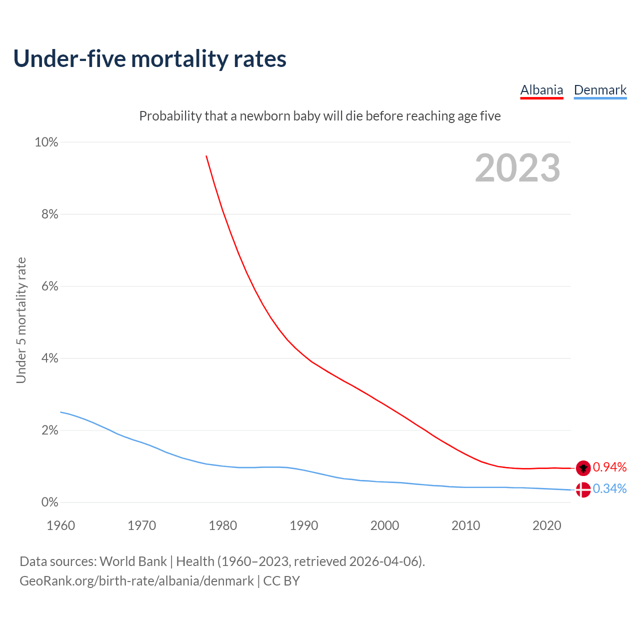 The chance that a newborn baby will die before reaching age five is 0.94% in Albania and 0.34% in Denmark. Above is a chart with historical data on under-five mortality rates.