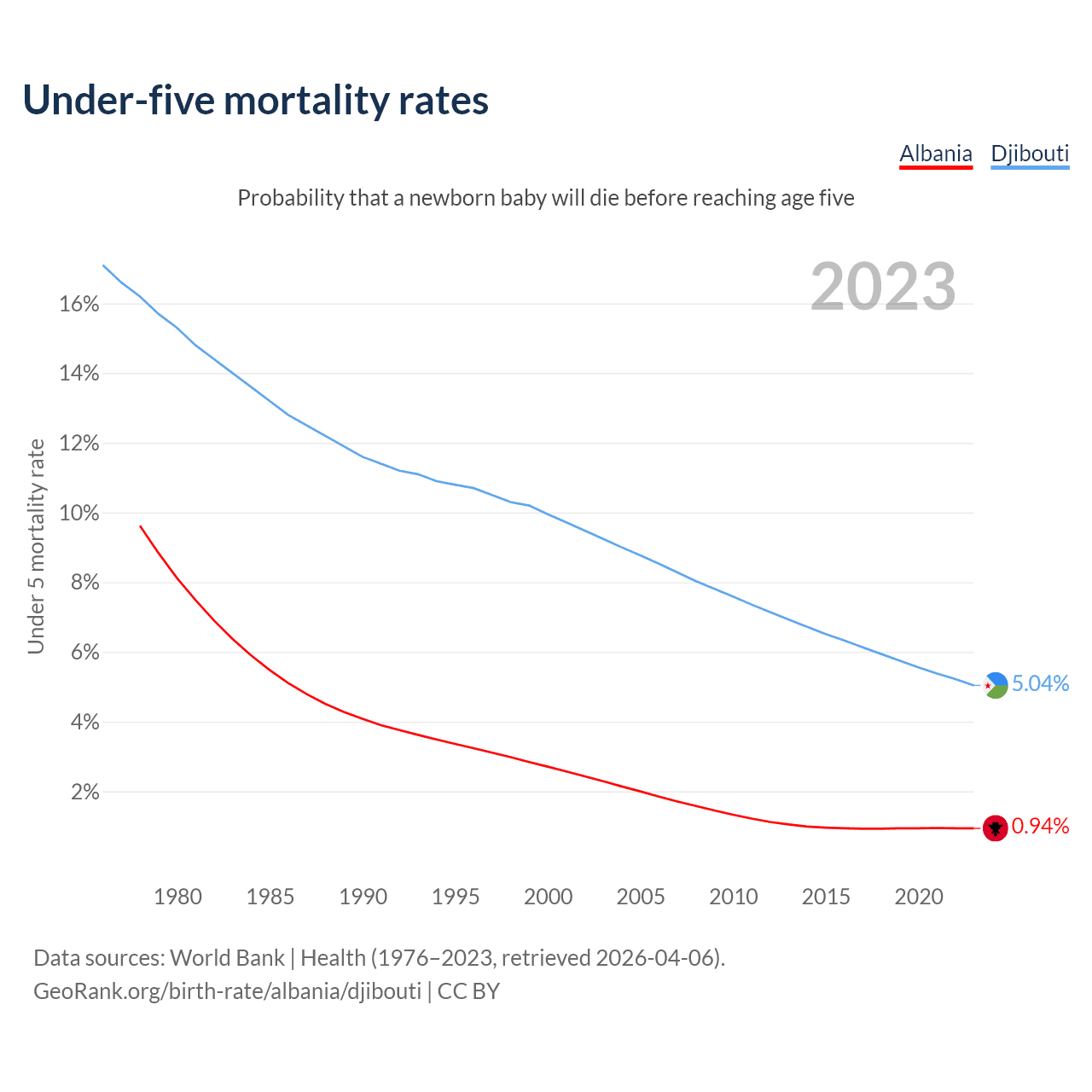 The chance that a newborn baby will die before reaching age five is 0.94% in Albania and 5.04% in Djibouti. Above is a chart with historical data on under-five mortality rates.