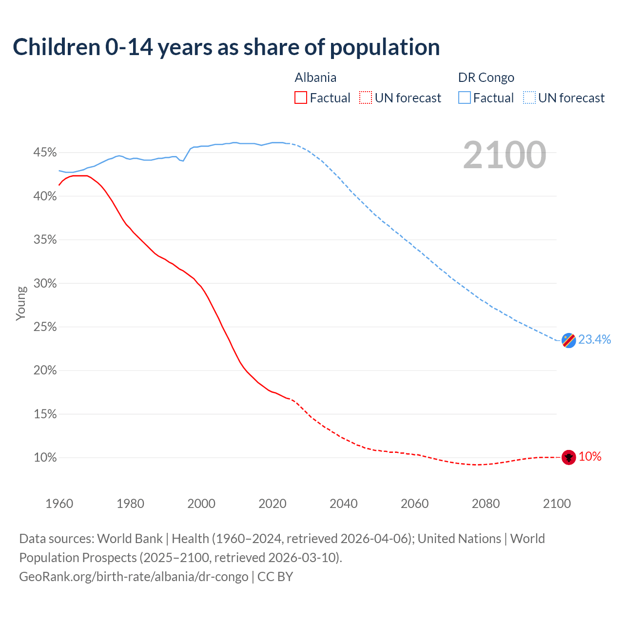 Albania has an annual birth rate of 10.2 births per 1,000 people, compared to 41.3 for the DR Congo. The average number of children a woman is expected to have during her lifetime — the fertility rate, is 1.35 in Albania and 6.05 in the DR Congo — 349% difference.