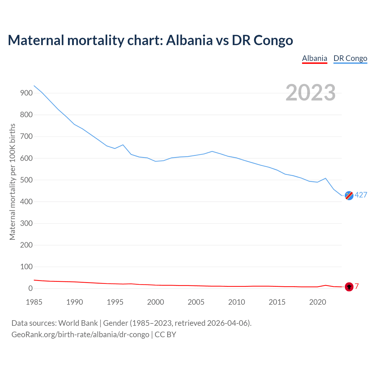 The maternal mortality rate, which is the probability of dying during childbirth or within 42 days of pregnancy termination, is 7 deaths per 100,000 live births in Albania, compared to 427 deaths in the DR Congo.