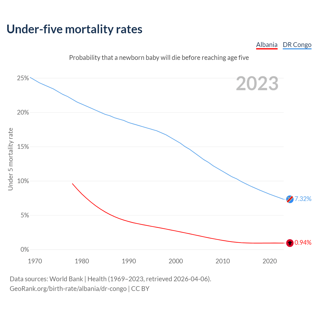 The chance that a newborn baby will die before reaching age five is 0.94% in Albania and 7.32% in the DR Congo. Above is a chart with historical data on under-five mortality rates.