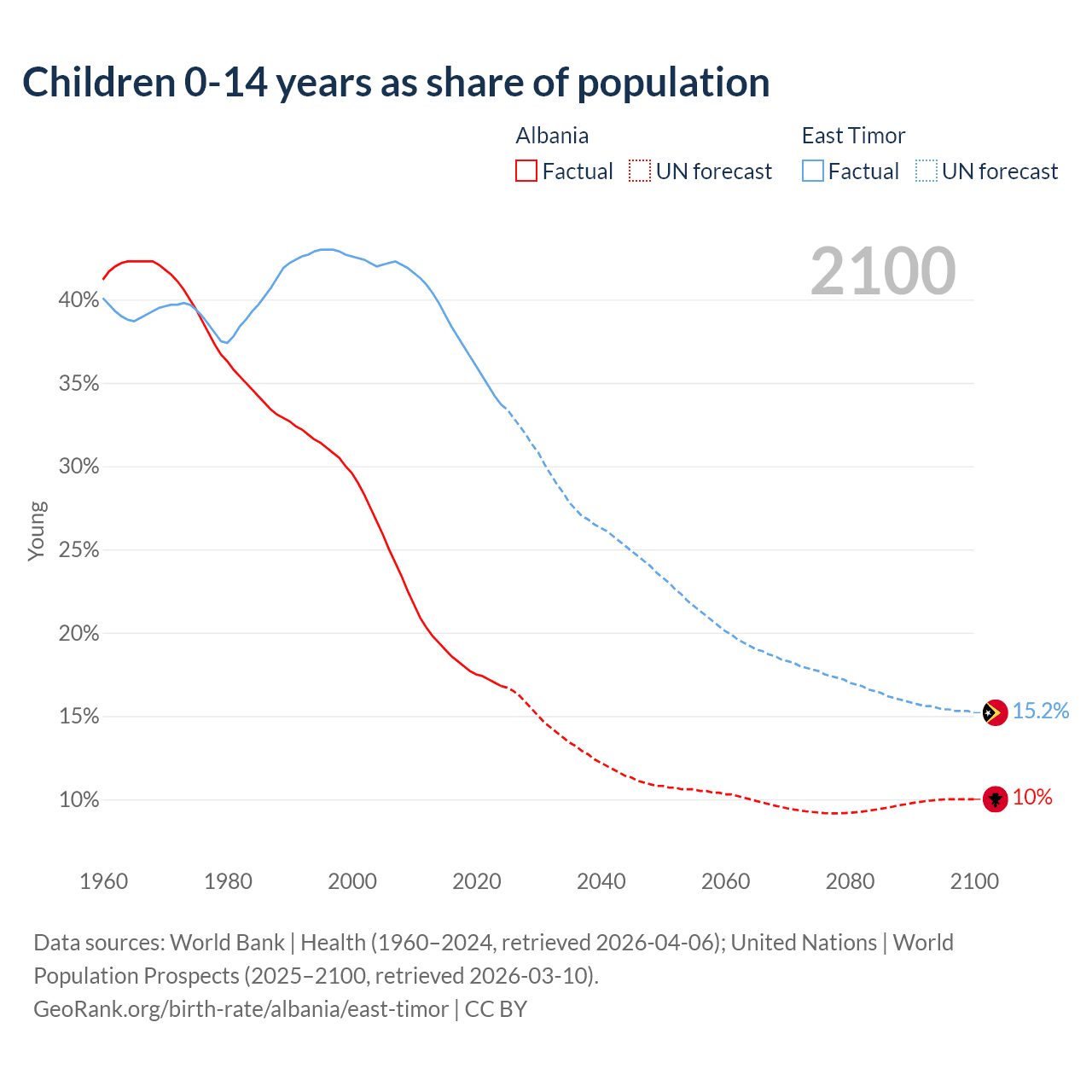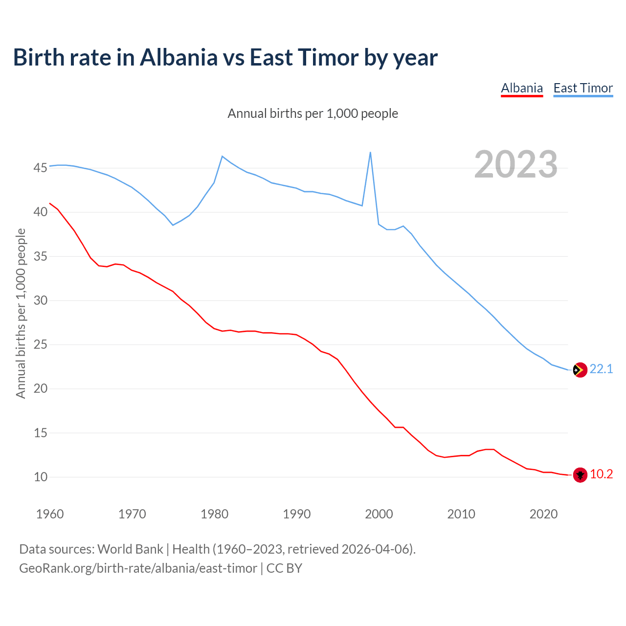 Albania has an annual birth rate of 10.2 births per 1,000 people, compared to 22.1 for East Timor. The average number of children a woman is expected to have during her lifetime — the fertility rate, is 1.35 in Albania and 2.71 in East Timor — 100.8% difference.