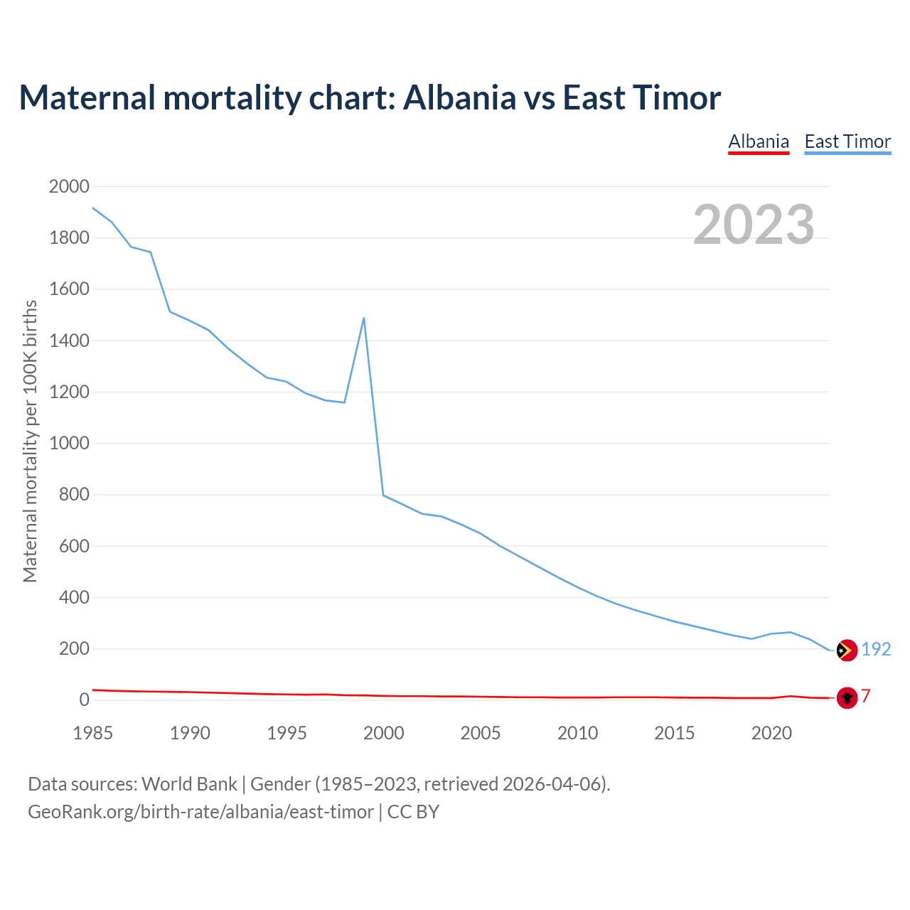 The maternal mortality rate, which is the probability of dying during childbirth or within 42 days of pregnancy termination, is 7 deaths per 100,000 live births in Albania, compared to 192 deaths in East Timor.
