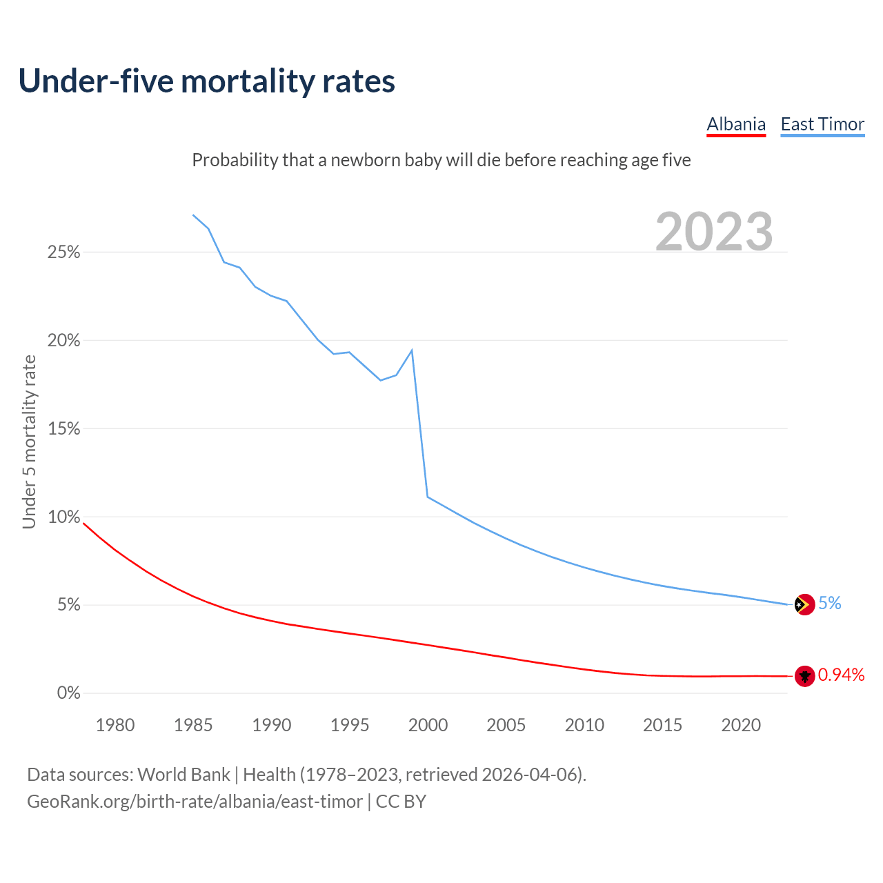 The chance that a newborn baby will die before reaching age five is 0.94% in Albania and 5% in East Timor. Above is a chart with historical data on under-five mortality rates.