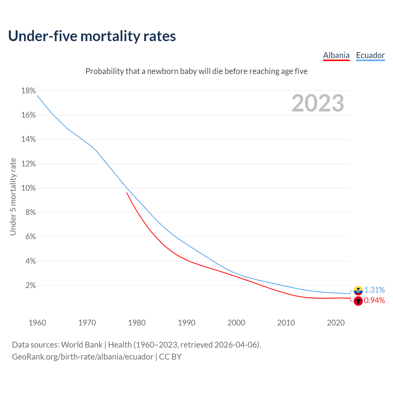 The chance that a newborn baby will die before reaching age five is 0.94% in Albania and 1.31% in Ecuador. Above is a chart with historical data on under-five mortality rates.
