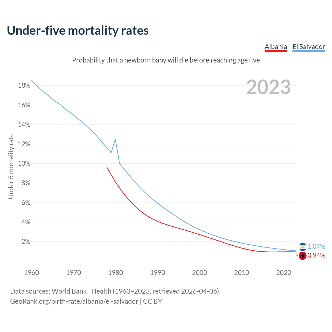 The chance that a newborn baby will die before reaching age five is 0.94% in Albania and 1.04% in El Salvador. Above is a chart with historical data on under-five mortality rates.
