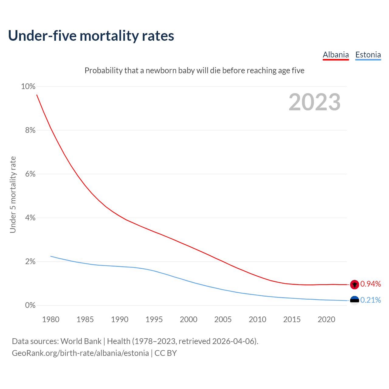 The chance that a newborn baby will die before reaching age five is 0.94% in Albania and 0.21% in Estonia. Above is a chart with historical data on under-five mortality rates.
