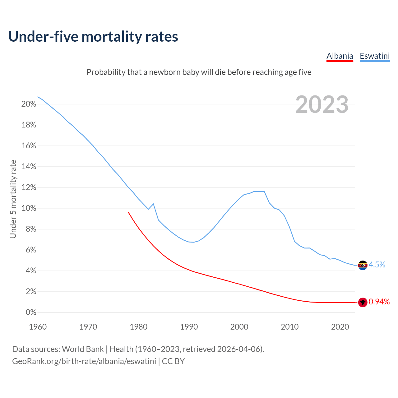The chance that a newborn baby will die before reaching age five is 0.94% in Albania and 4.5% in Eswatini. Above is a chart with historical data on under-five mortality rates.