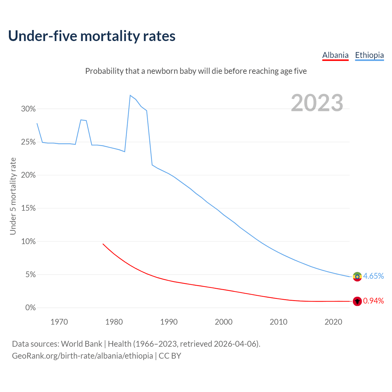 The chance that a newborn baby will die before reaching age five is 0.94% in Albania and 4.65% in Ethiopia. Above is a chart with historical data on under-five mortality rates.