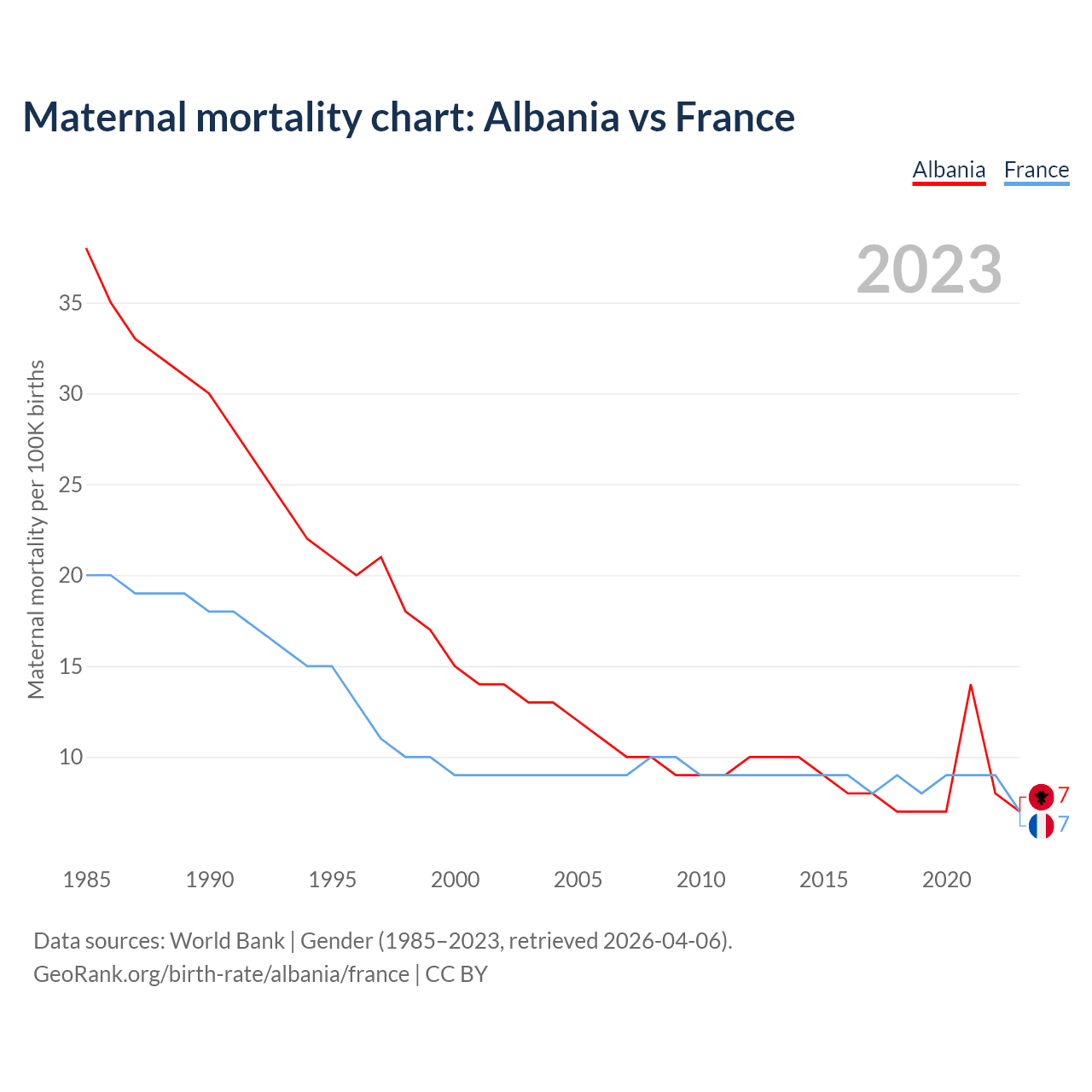 The maternal mortality rate, which is the probability of dying during childbirth or within 42 days of pregnancy termination, is 7 deaths per 100,000 live births in Albania, compared to 7 deaths in France.