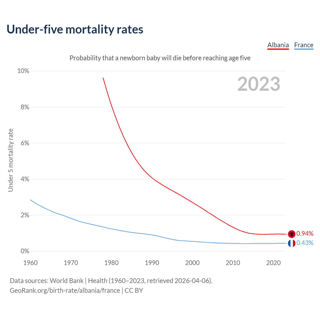The chance that a newborn baby will die before reaching age five is 0.94% in Albania and 0.43% in France. Above is a chart with historical data on under-five mortality rates.