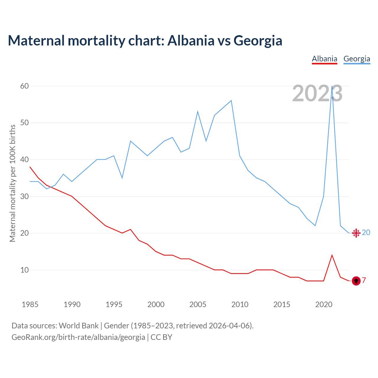 The maternal mortality rate, which is the probability of dying during childbirth or within 42 days of pregnancy termination, is 7 deaths per 100,000 live births in Albania, compared to 20 deaths in Georgia.