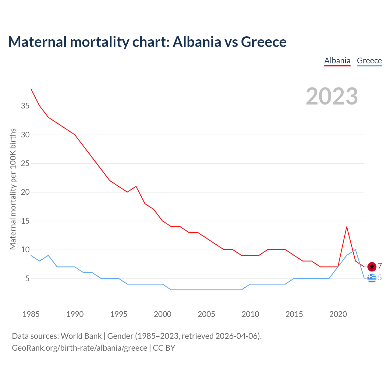 The maternal mortality rate, which is the probability of dying during childbirth or within 42 days of pregnancy termination, is 7 deaths per 100,000 live births in Albania, compared to 5 deaths in Greece.