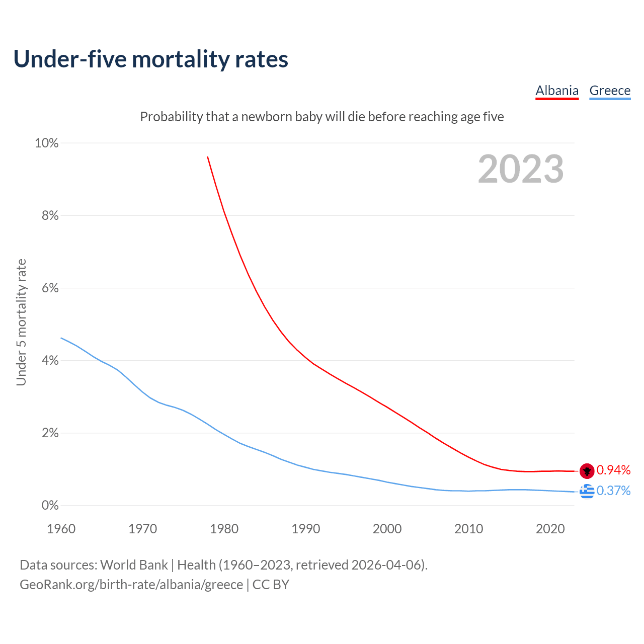 The chance that a newborn baby will die before reaching age five is 0.94% in Albania and 0.37% in Greece. Above is a chart with historical data on under-five mortality rates.