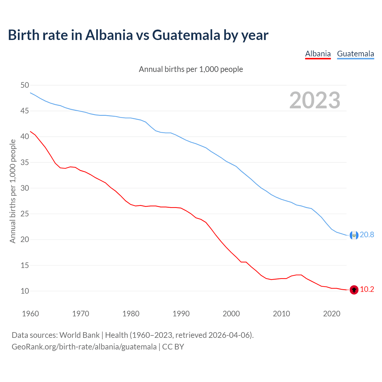 Albania has an annual birth rate of 10.2 births per 1,000 people, compared to 20.8 for Guatemala. The average number of children a woman is expected to have during her lifetime — the fertility rate, is 1.35 in Albania and 2.31 in Guatemala — 71.4% difference.