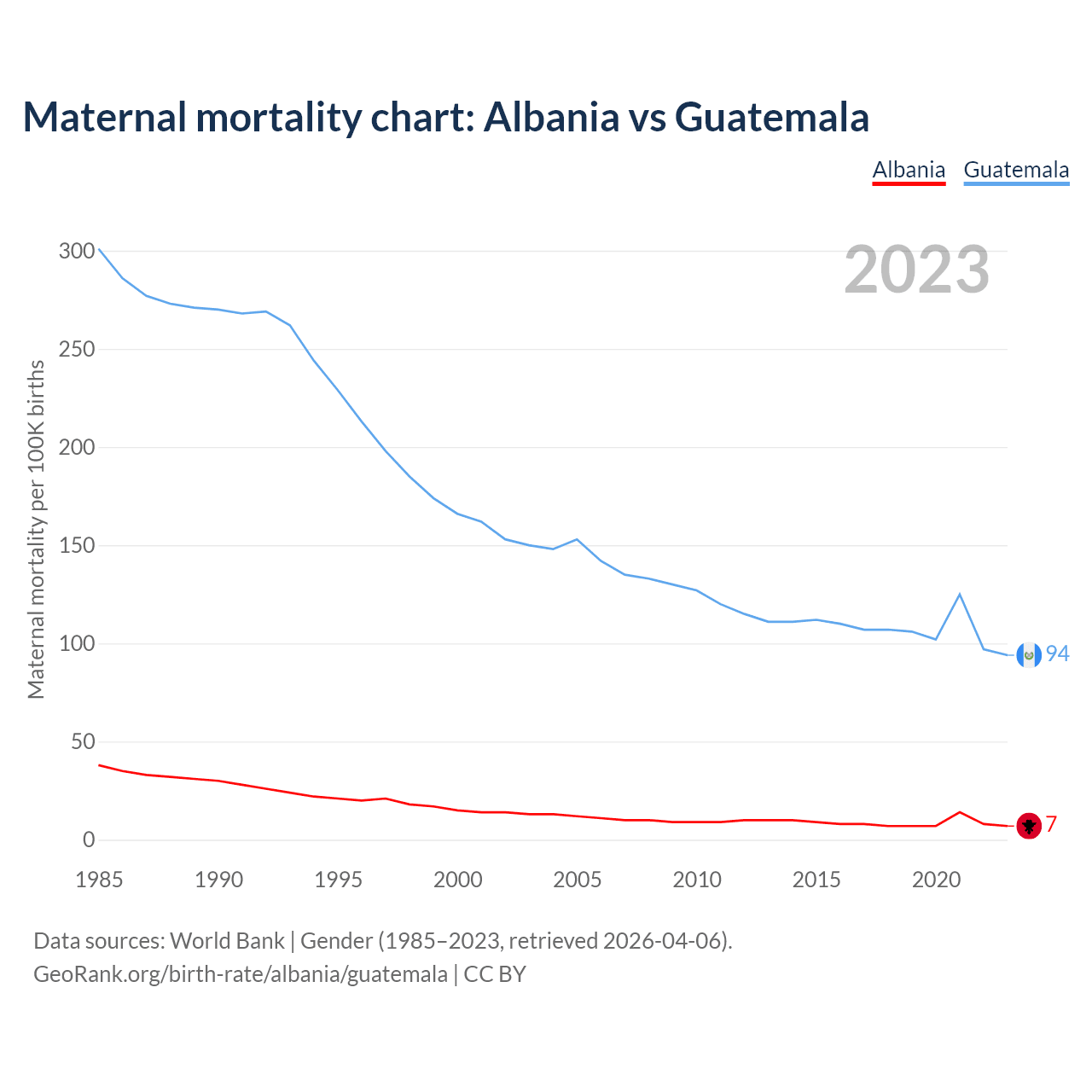 The maternal mortality rate, which is the probability of dying during childbirth or within 42 days of pregnancy termination, is 7 deaths per 100,000 live births in Albania, compared to 94 deaths in Guatemala.