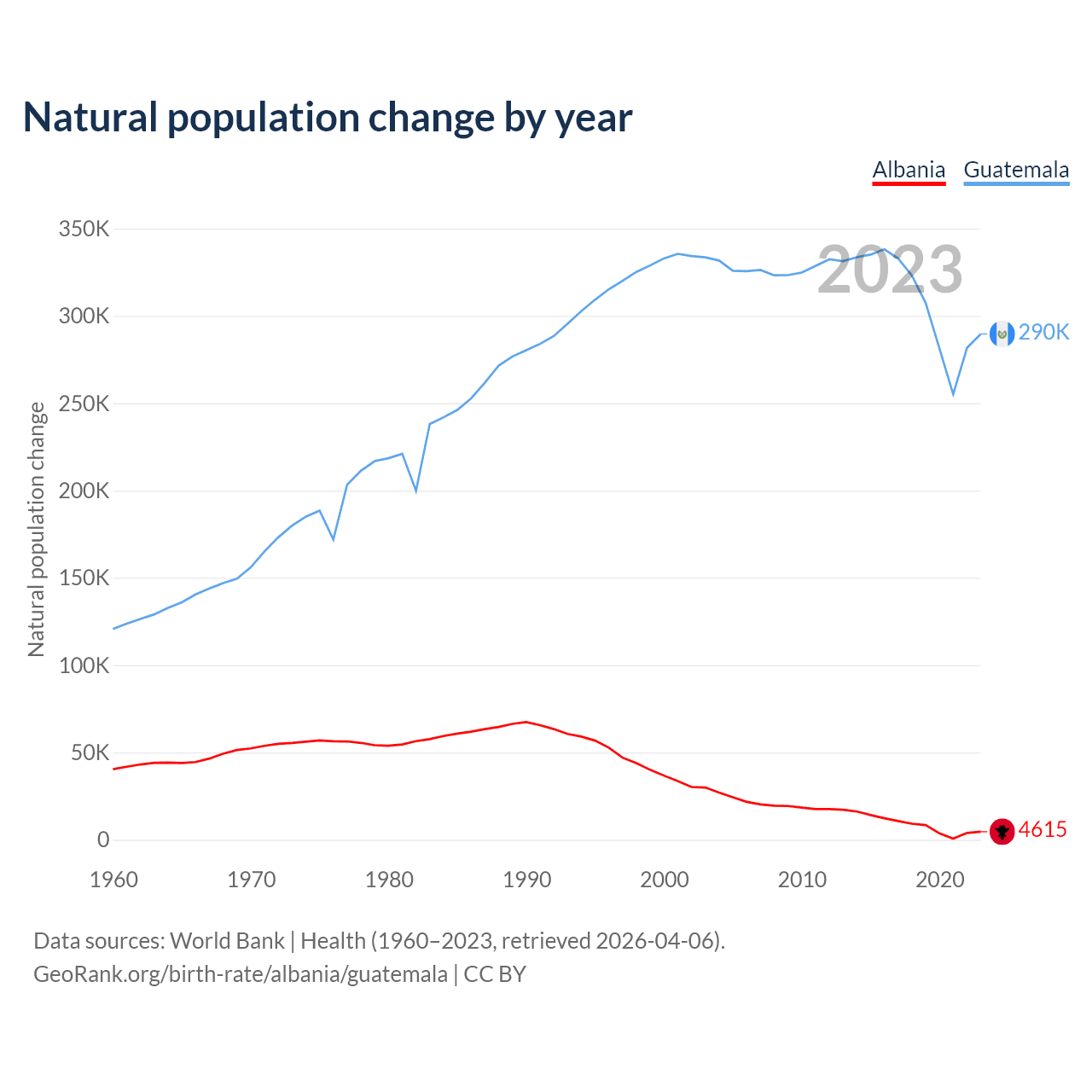 According to the latest available data on birth rates, the fertility rate in Albania was 1.35 children per woman in 2023, compared to 2.31 in Guatemala in 2023. The replacement level is considered to be 2.1 children per woman.