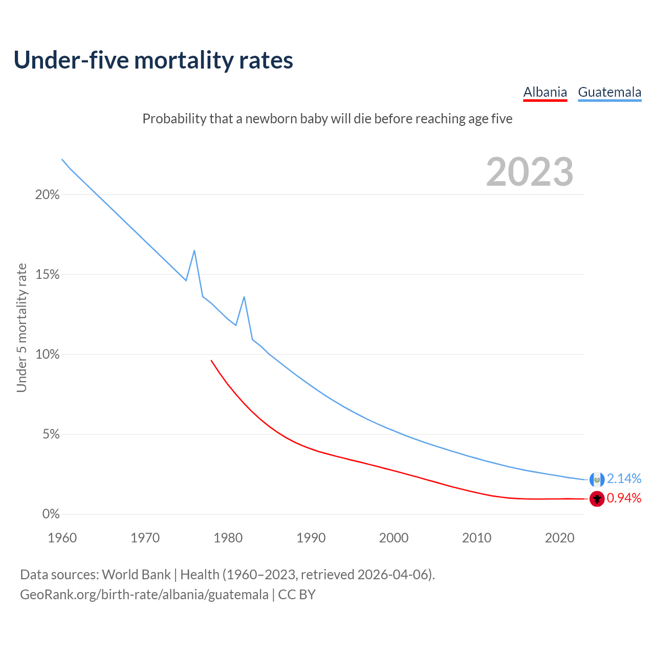The chance that a newborn baby will die before reaching age five is 0.94% in Albania and 2.14% in Guatemala. Above is a chart with historical data on under-five mortality rates.