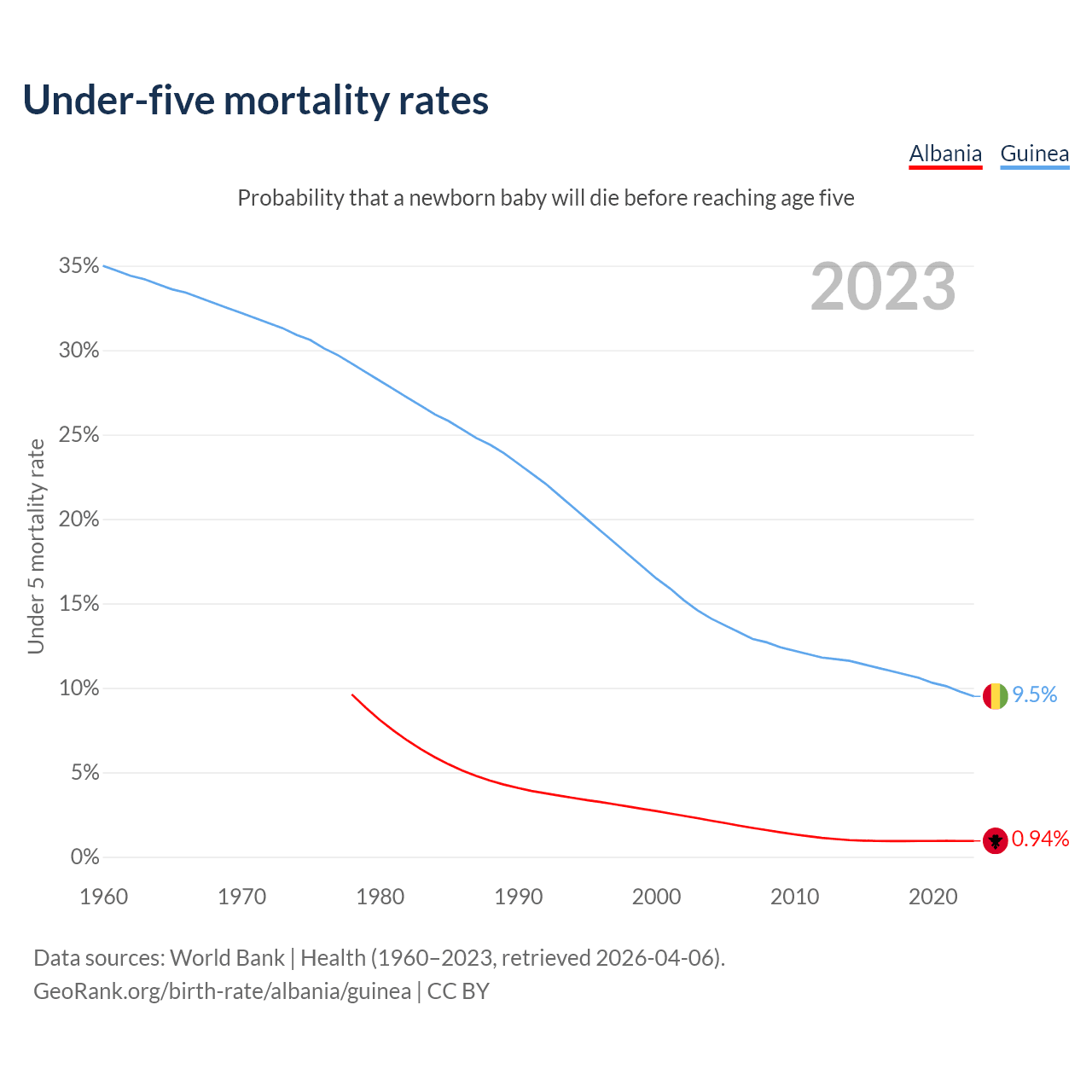 The chance that a newborn baby will die before reaching age five is 0.94% in Albania and 9.5% in Guinea. Above is a chart with historical data on under-five mortality rates.