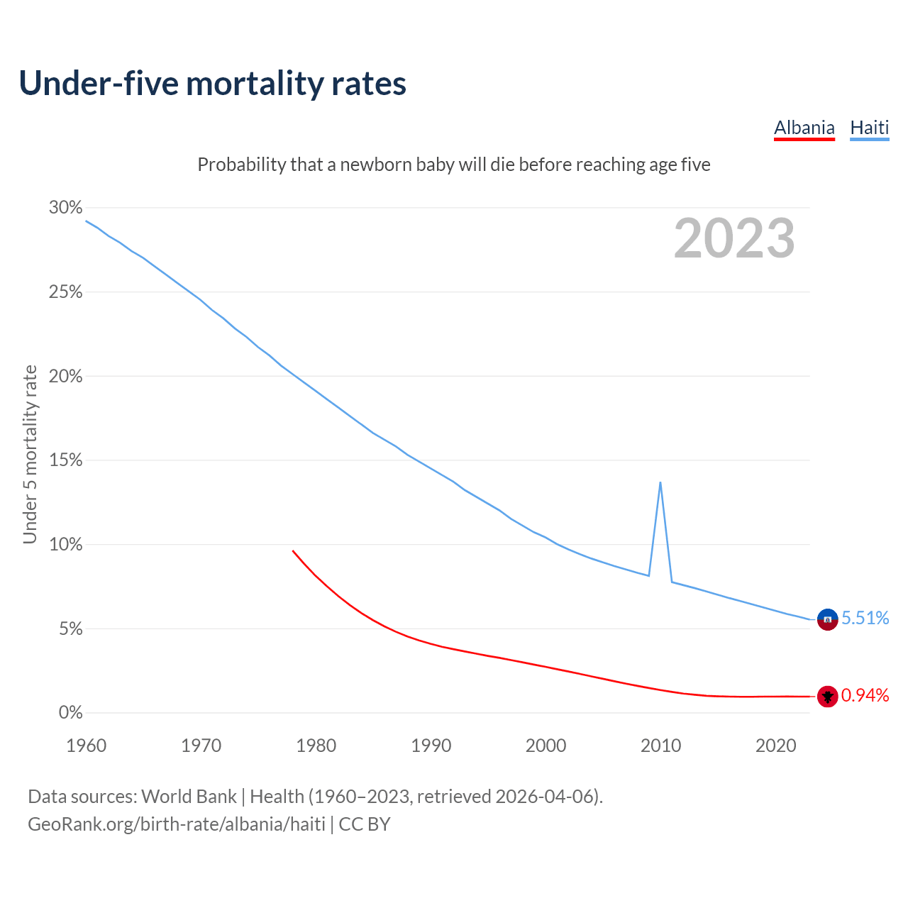 The chance that a newborn baby will die before reaching age five is 0.94% in Albania and 5.51% in Haiti. Above is a chart with historical data on under-five mortality rates.