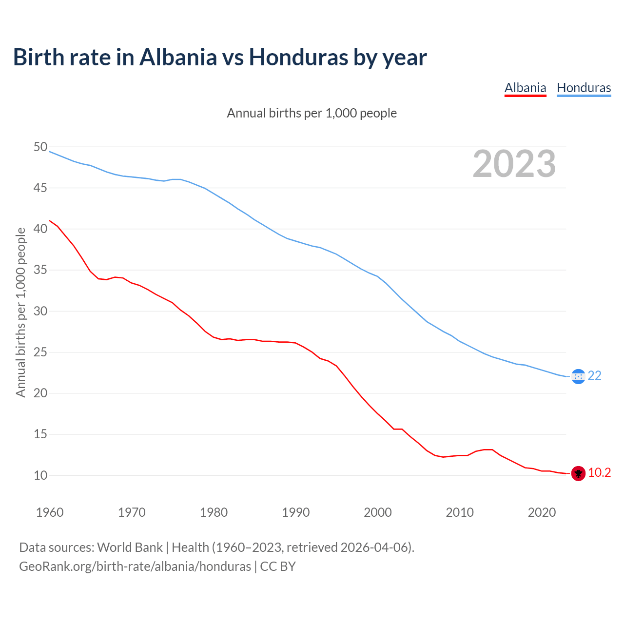 GeoRank.org/birth-rate/albania/honduras | CC BY