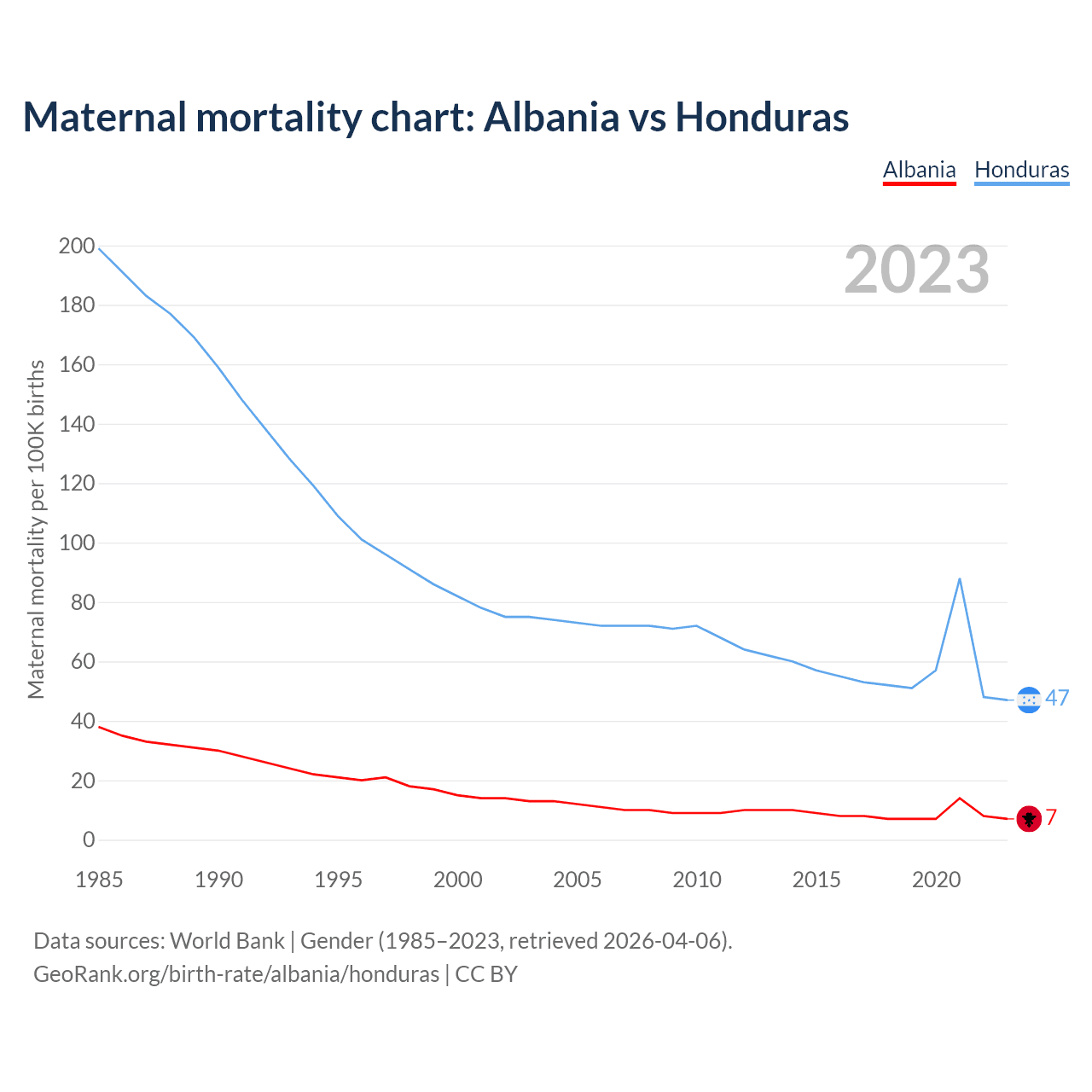 The maternal mortality rate, which is the probability of dying during childbirth or within 42 days of pregnancy termination, is 7 deaths per 100,000 live births in Albania, compared to 47 deaths in Honduras.