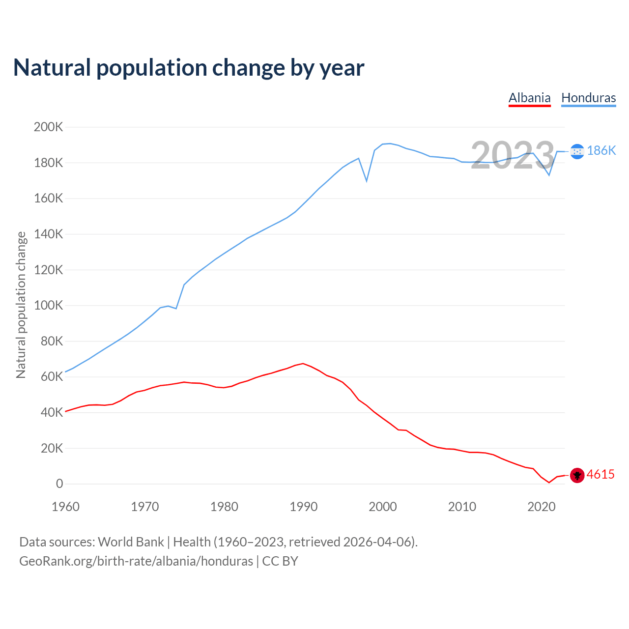 Albania has an annual birth rate of 10.2 births per 1,000 people, compared to 22 for Honduras. The average number of children a woman is expected to have during her lifetime — the fertility rate, is 1.35 in Albania and 2.5 in Honduras — 85.5% difference.