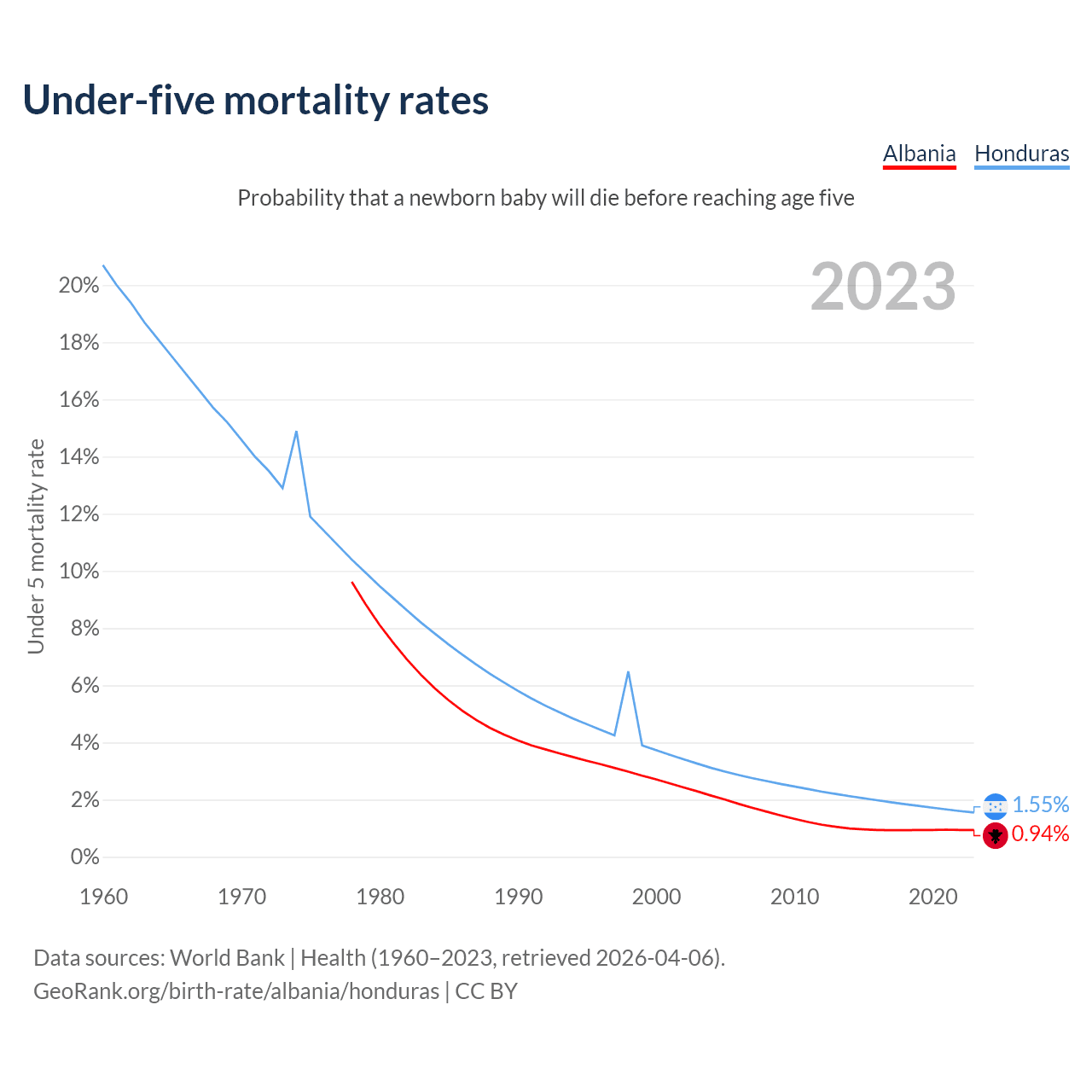 The chance that a newborn baby will die before reaching age five is 0.94% in Albania and 1.55% in Honduras. Above is a chart with historical data on under-five mortality rates.