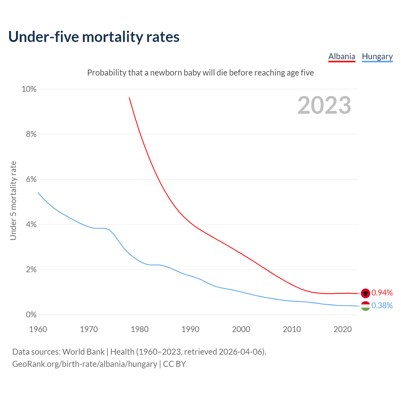 The chance that a newborn baby will die before reaching age five is 0.94% in Albania and 0.38% in Hungary. Above is a chart with historical data on under-five mortality rates.