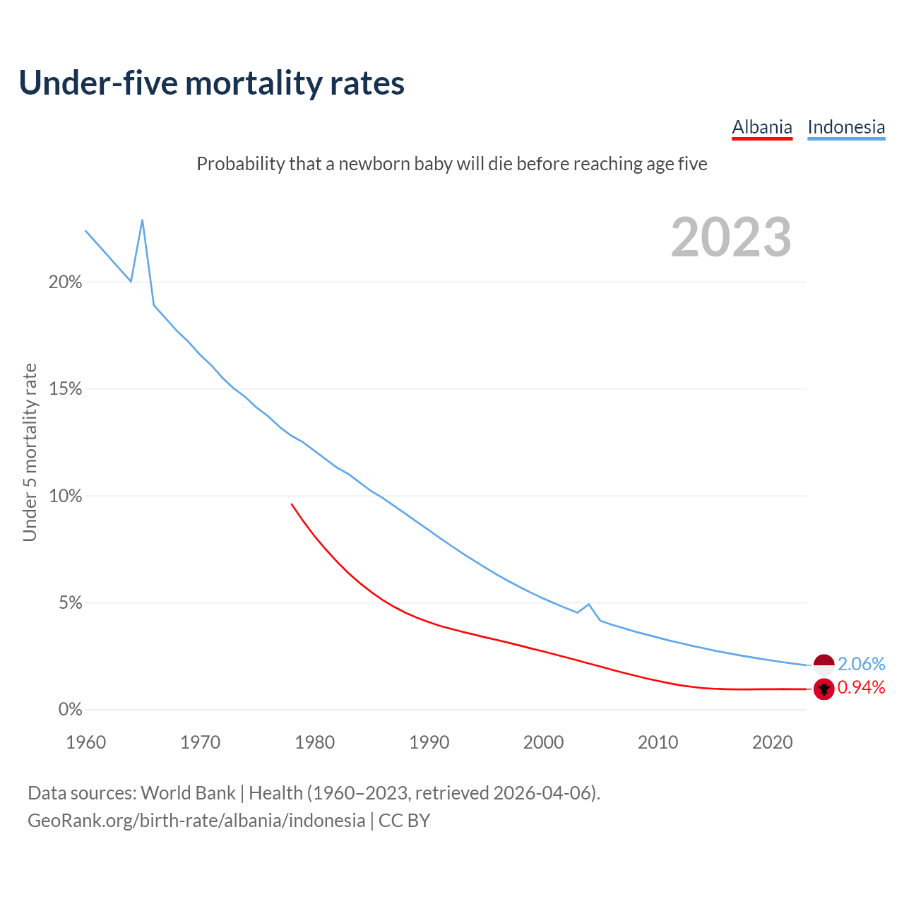 The chance that a newborn baby will die before reaching age five is 0.94% in Albania and 2.06% in Indonesia. Above is a chart with historical data on under-five mortality rates.