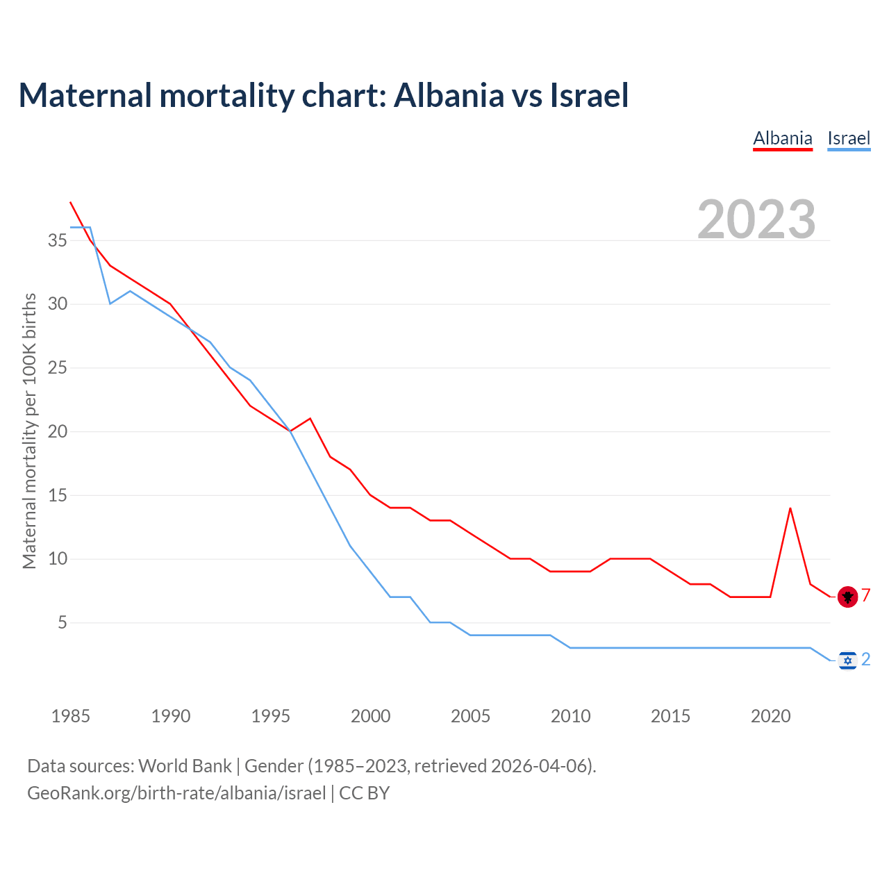 The maternal mortality rate, which is the probability of dying during childbirth or within 42 days of pregnancy termination, is 7 deaths per 100,000 live births in Albania, compared to 2 deaths in Israel.