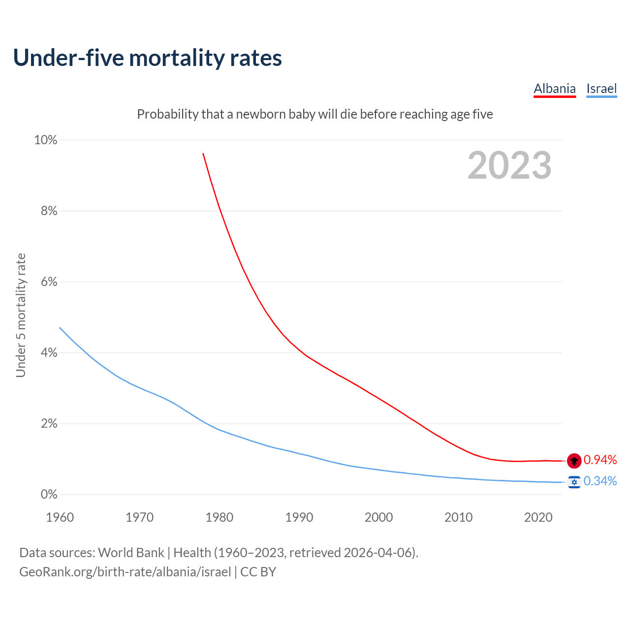 The chance that a newborn baby will die before reaching age five is 0.94% in Albania and 0.34% in Israel. Above is a chart with historical data on under-five mortality rates.