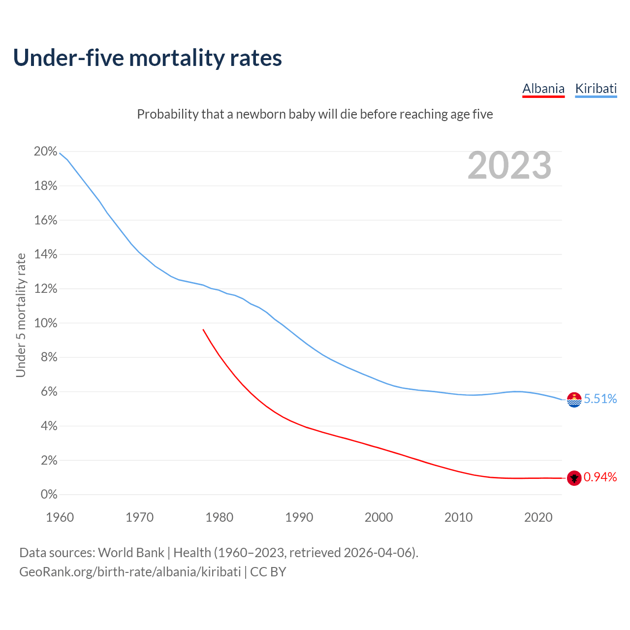 The chance that a newborn baby will die before reaching age five is 0.94% in Albania and 5.51% in Kiribati. Above is a chart with historical data on under-five mortality rates.
