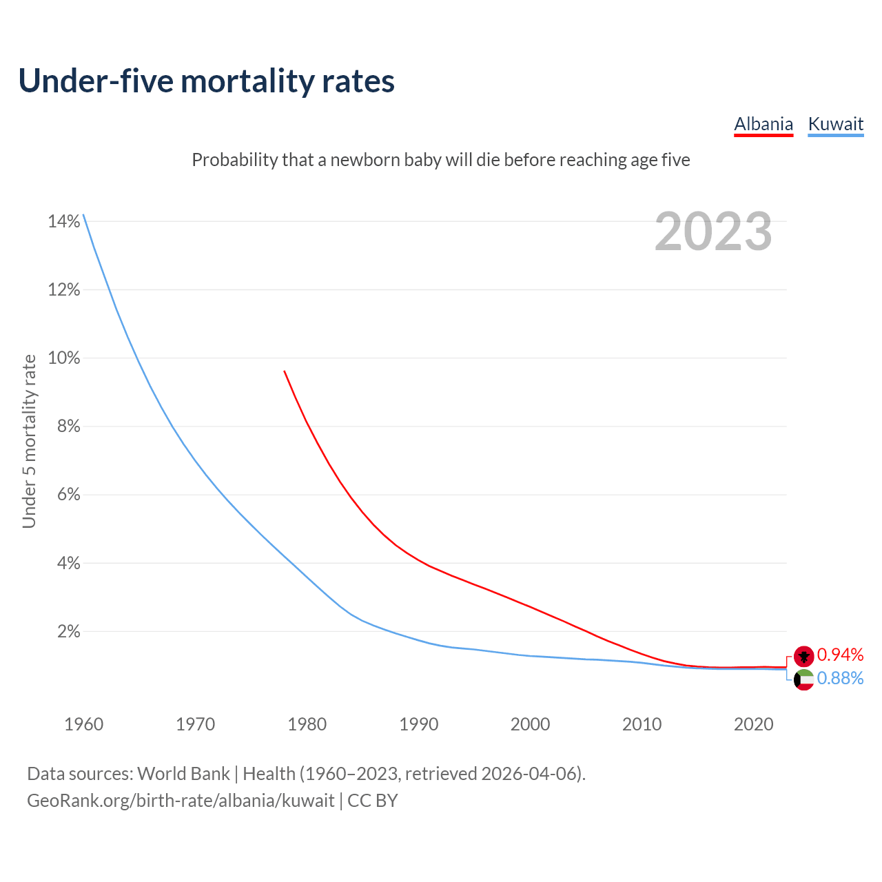 The chance that a newborn baby will die before reaching age five is 0.94% in Albania and 0.88% in Kuwait. Above is a chart with historical data on under-five mortality rates.