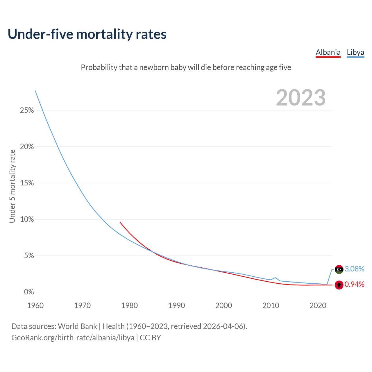 The chance that a newborn baby will die before reaching age five is 0.94% in Albania and 3.08% in Libya. Above is a chart with historical data on under-five mortality rates.